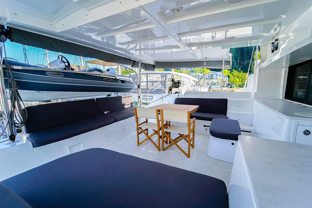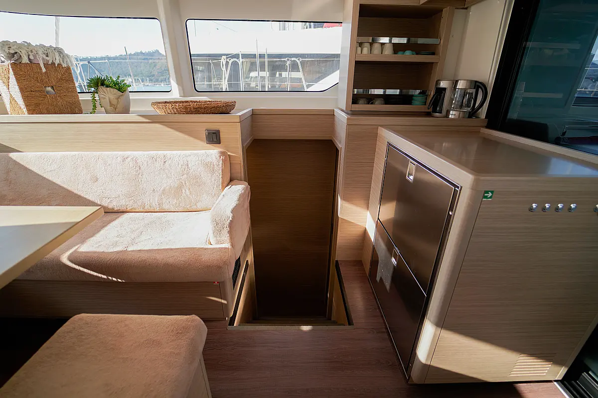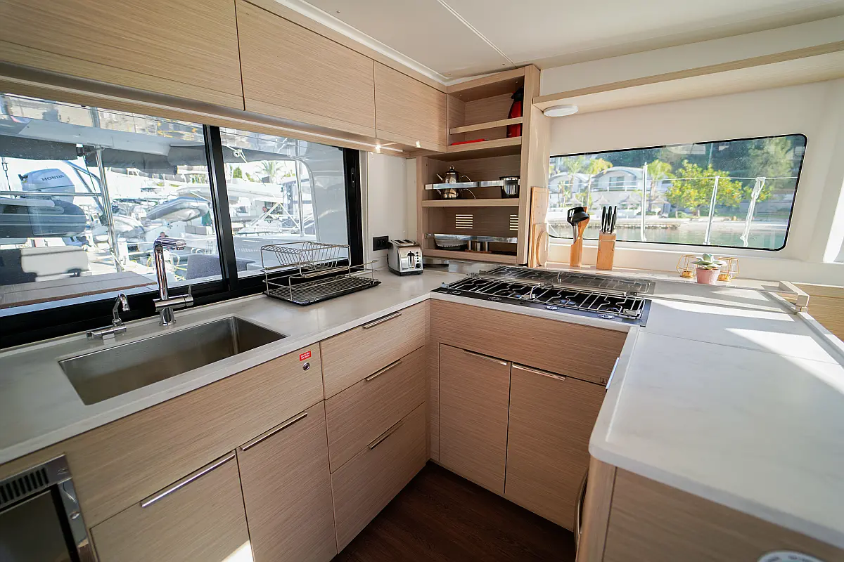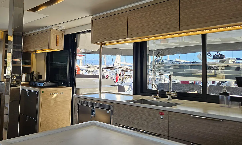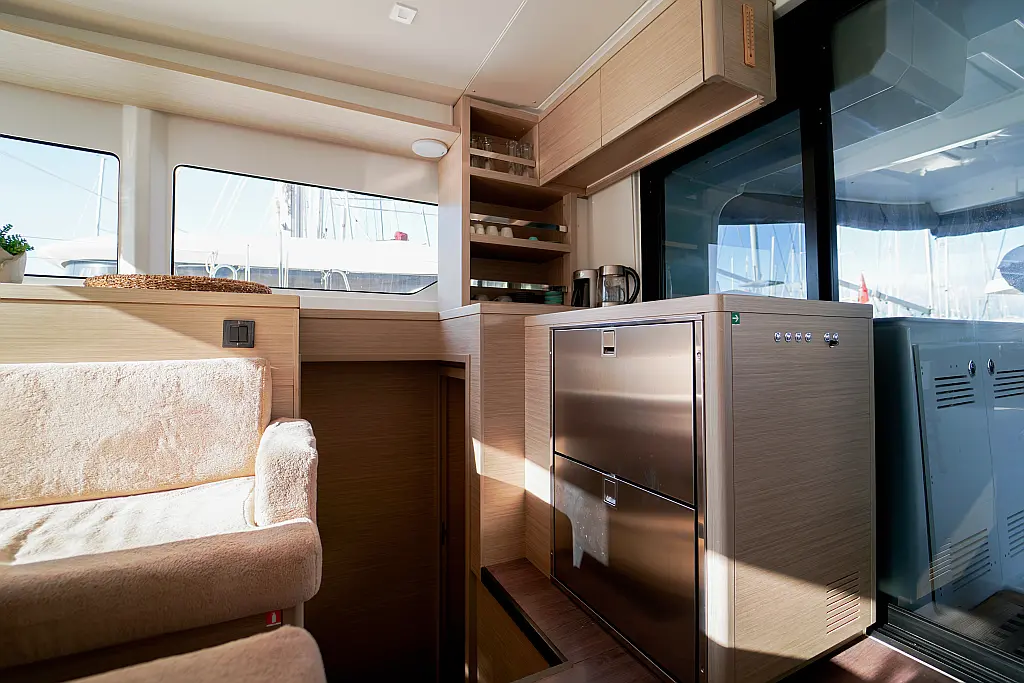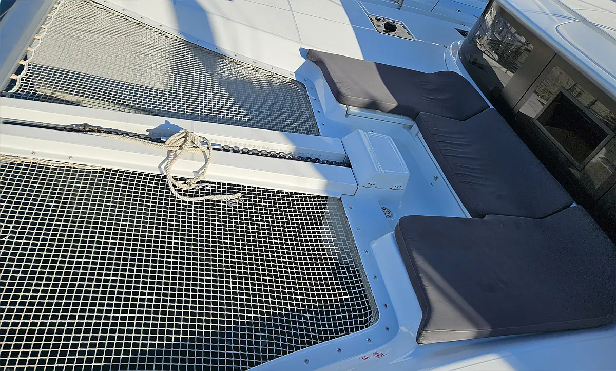 Klimaanlage, Eismaschine, Flybridge, Wassermacher, Generator, Beiboot, Inverter, Elektrische Winch (Segel), Außenbordmotor, Elektrische Toilette, Bimini, Kühlschrank