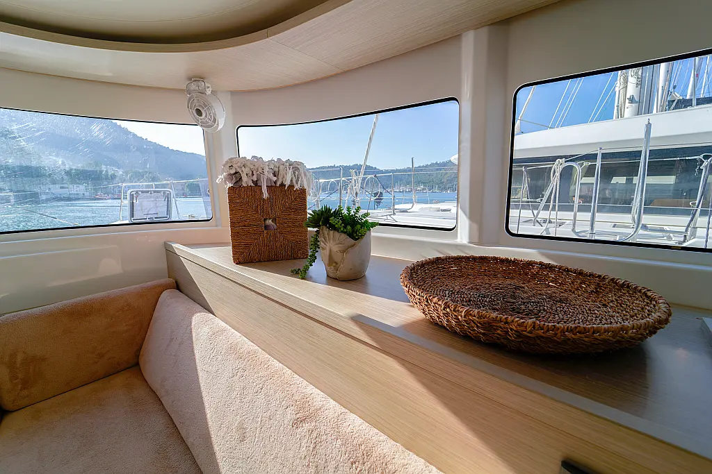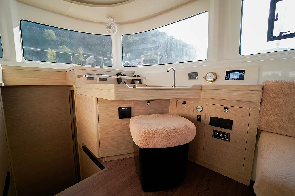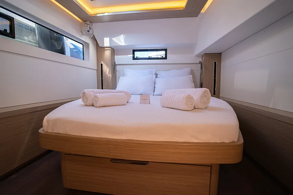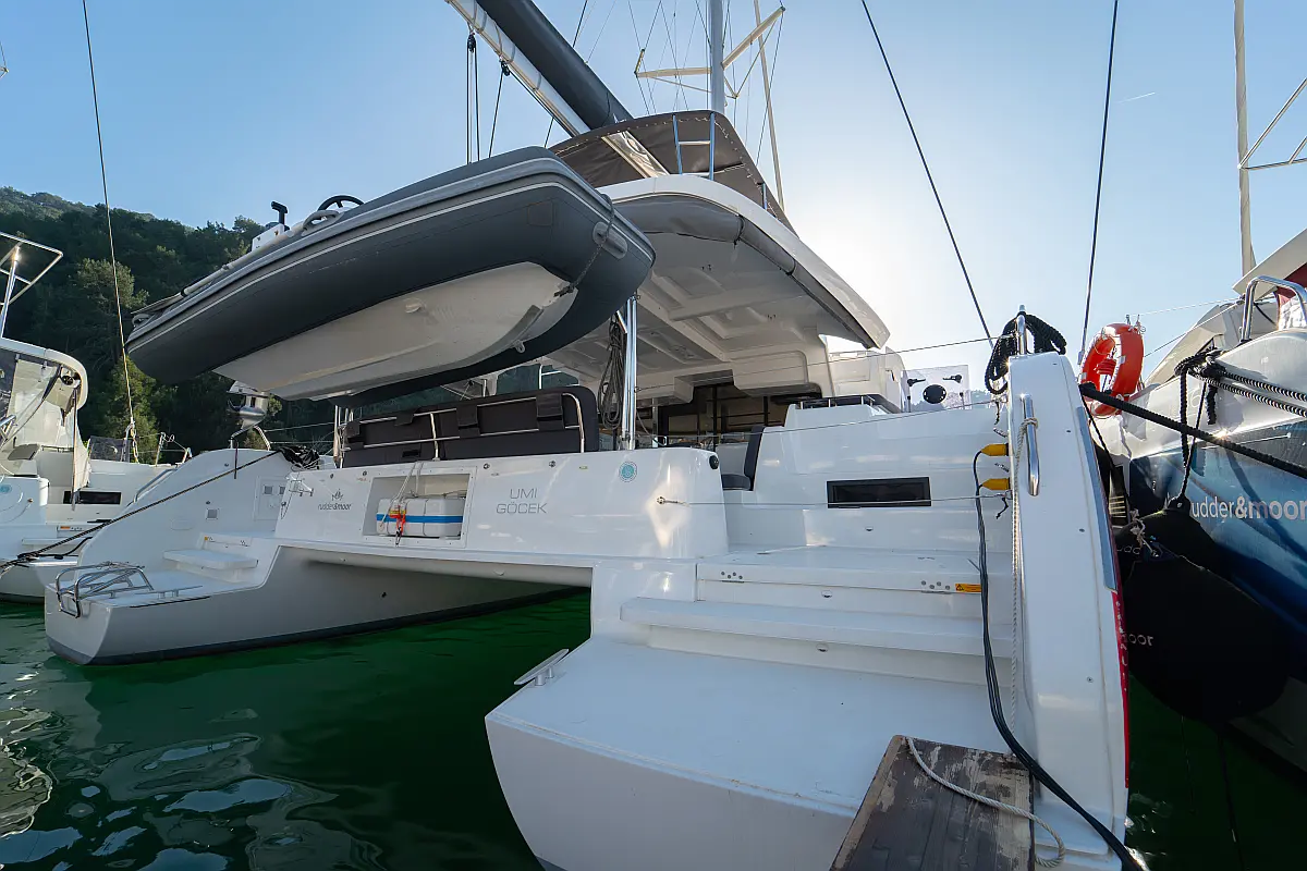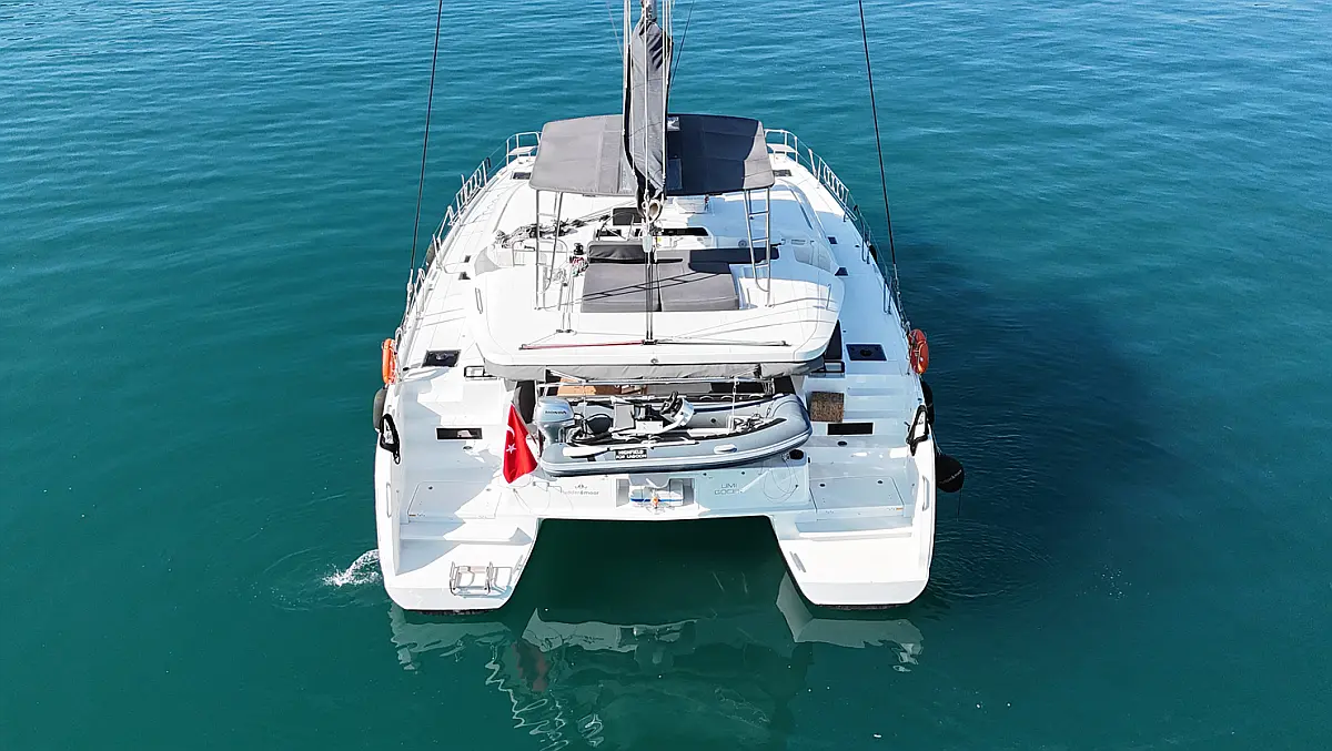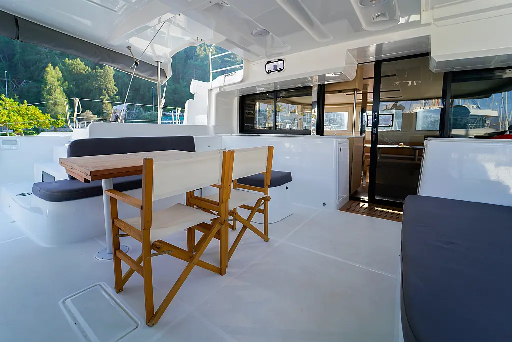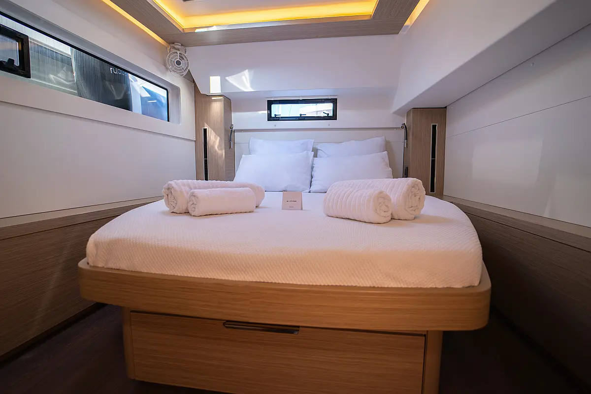 Klimaanlage, Eismaschine, Flybridge, Wassermacher, Generator, Beiboot, Inverter, Elektrische Winch (Segel), Außenbordmotor, Elektrische Toilette, Bimini, Kühlschrank