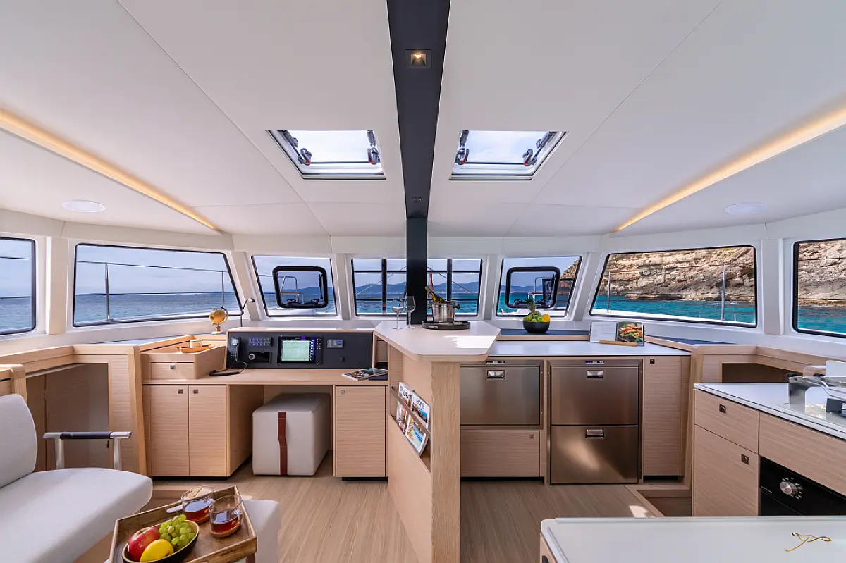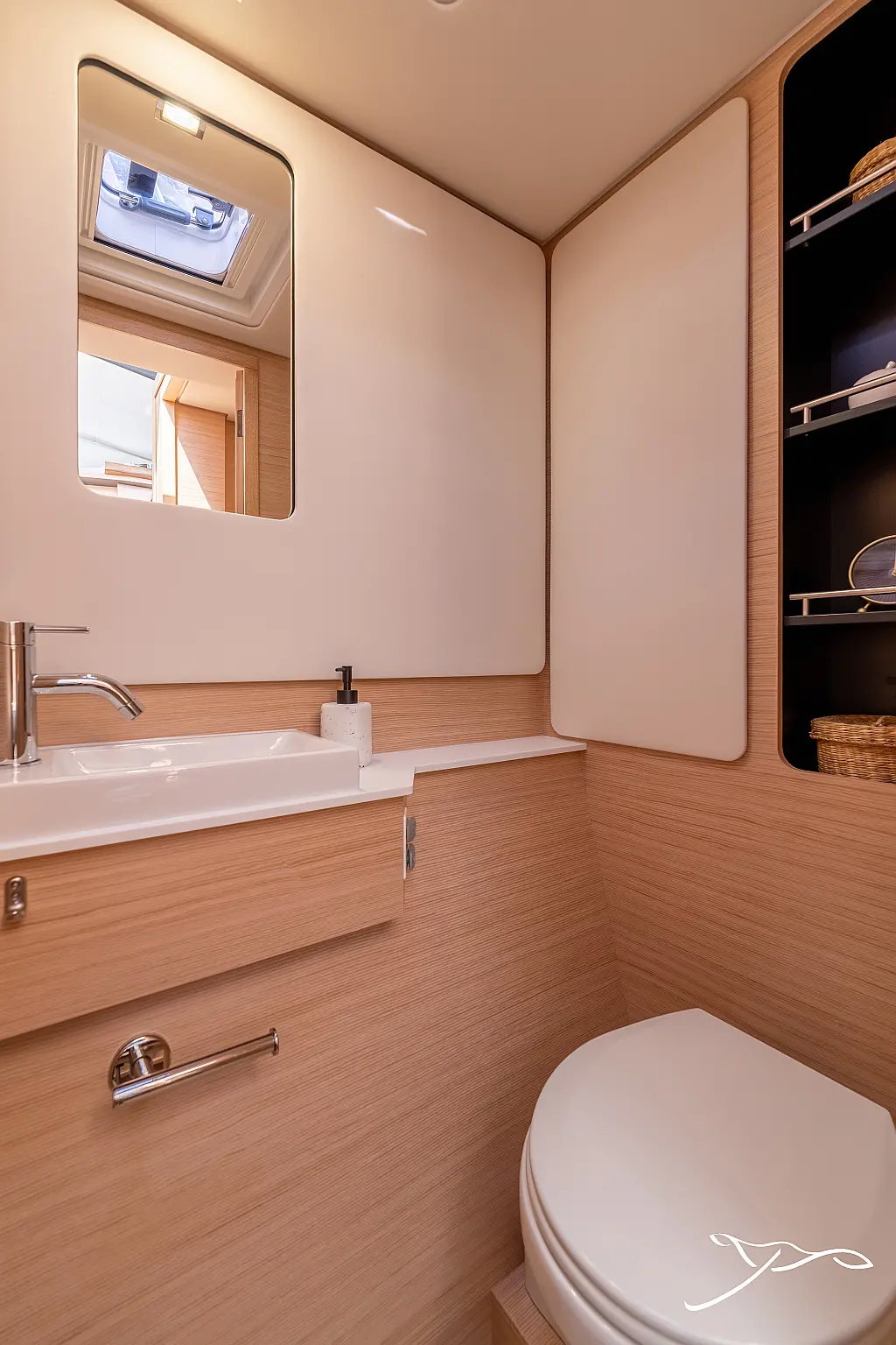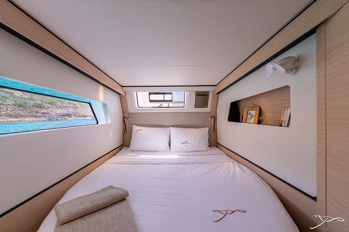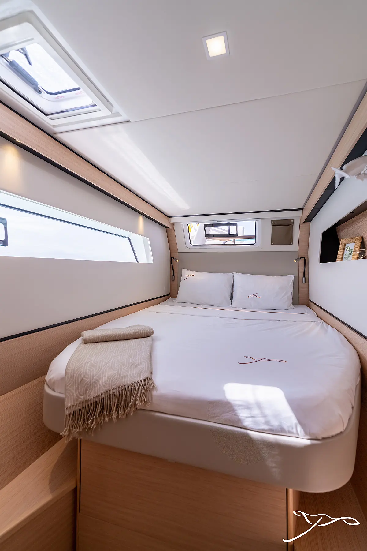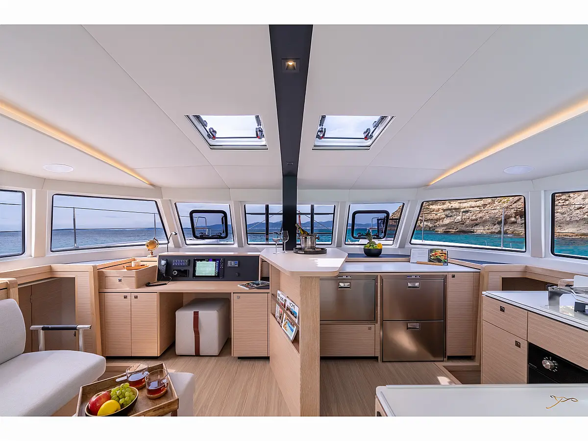 Air condition, Heating, Bimini, Refrigerator, Electric winches, Generator, Solar Panels, Outboard engine, Dinghy, Water maker, Electric toilet, Cockpit speakers