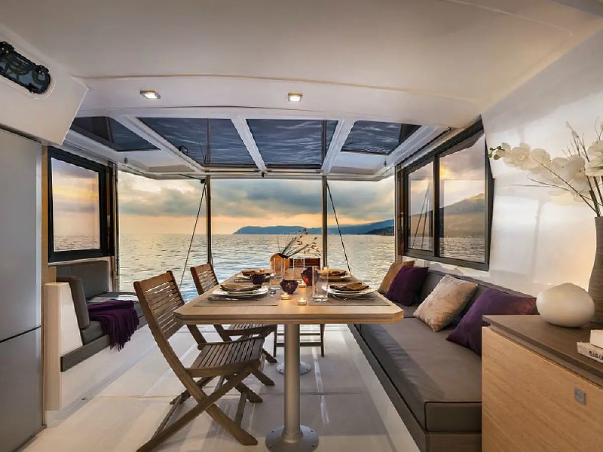 Heizung, Solar-Panele, Kaffeemaschine, Bimini, Cockpit-Kissen, Beiboot, Kühlschrank, Wi-Fi und Internet