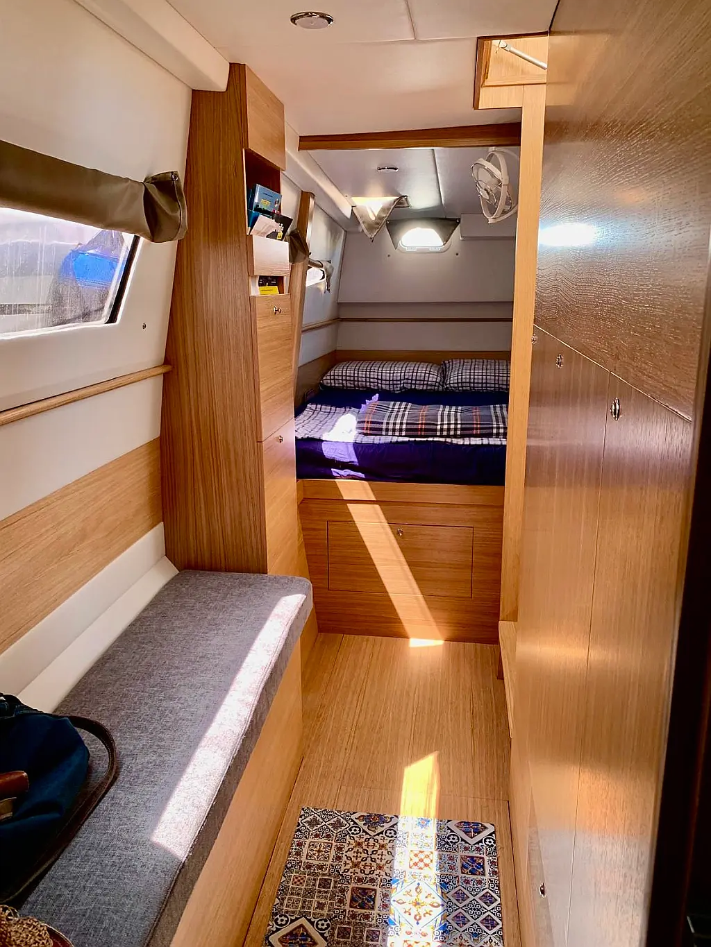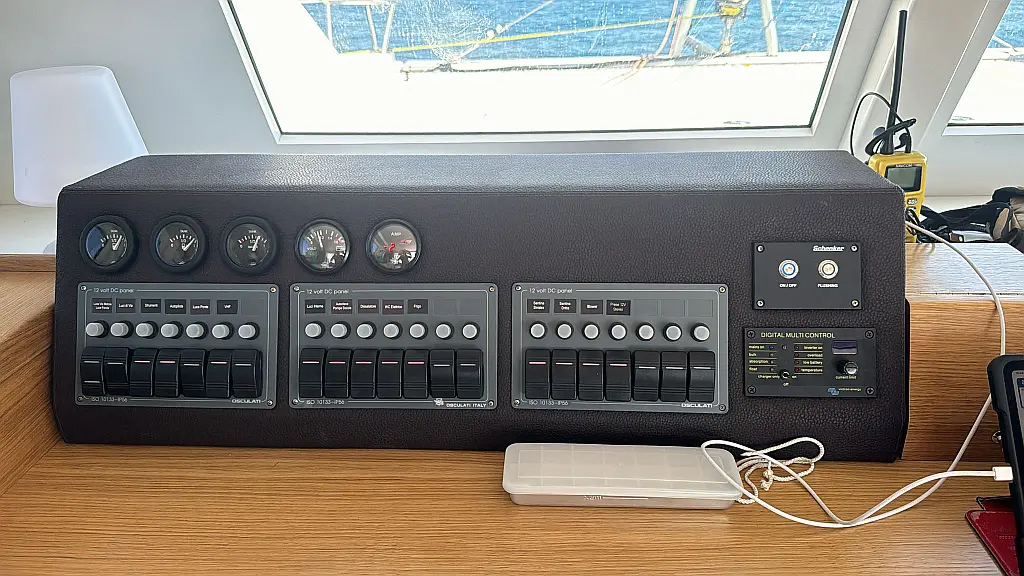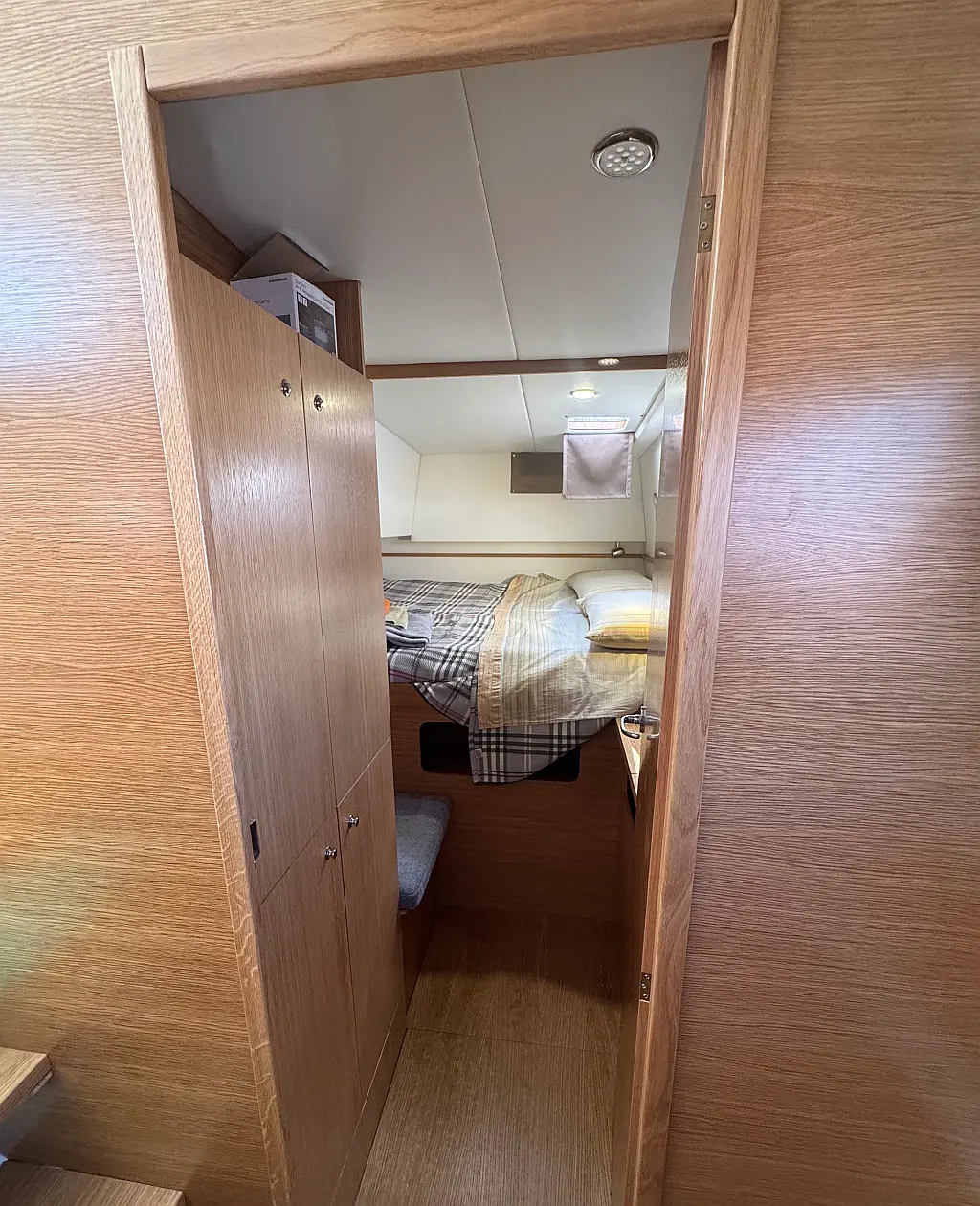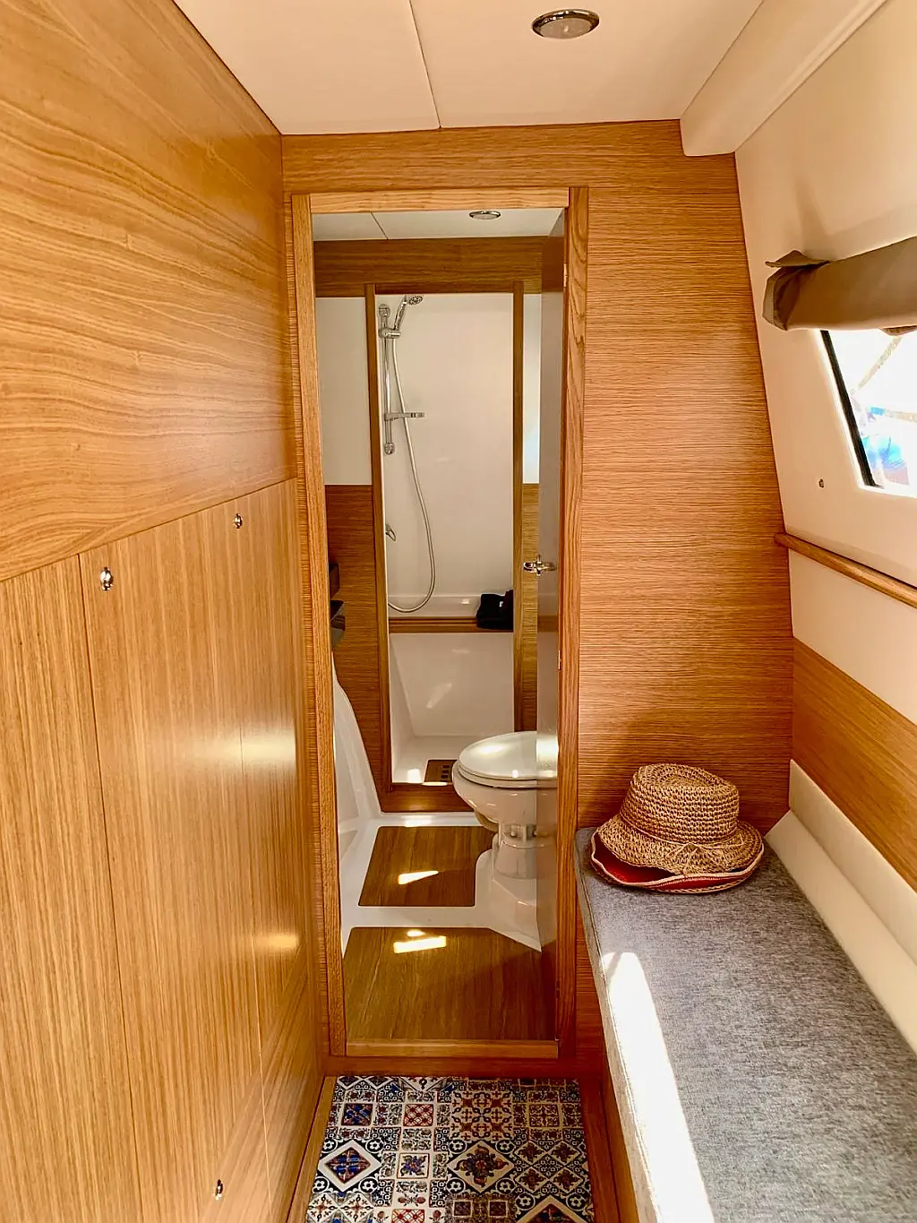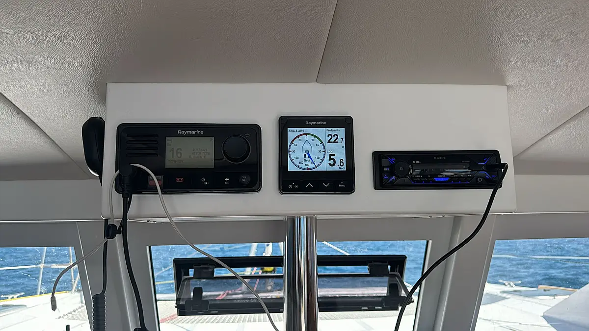 Bimini, Kaffeemaschine, Elektrische Toilette, Elektrische Winch (Segel), Inverter, Kühlschrank, Solar-Panele, Sprayhood, Beiboot, Wassermacher