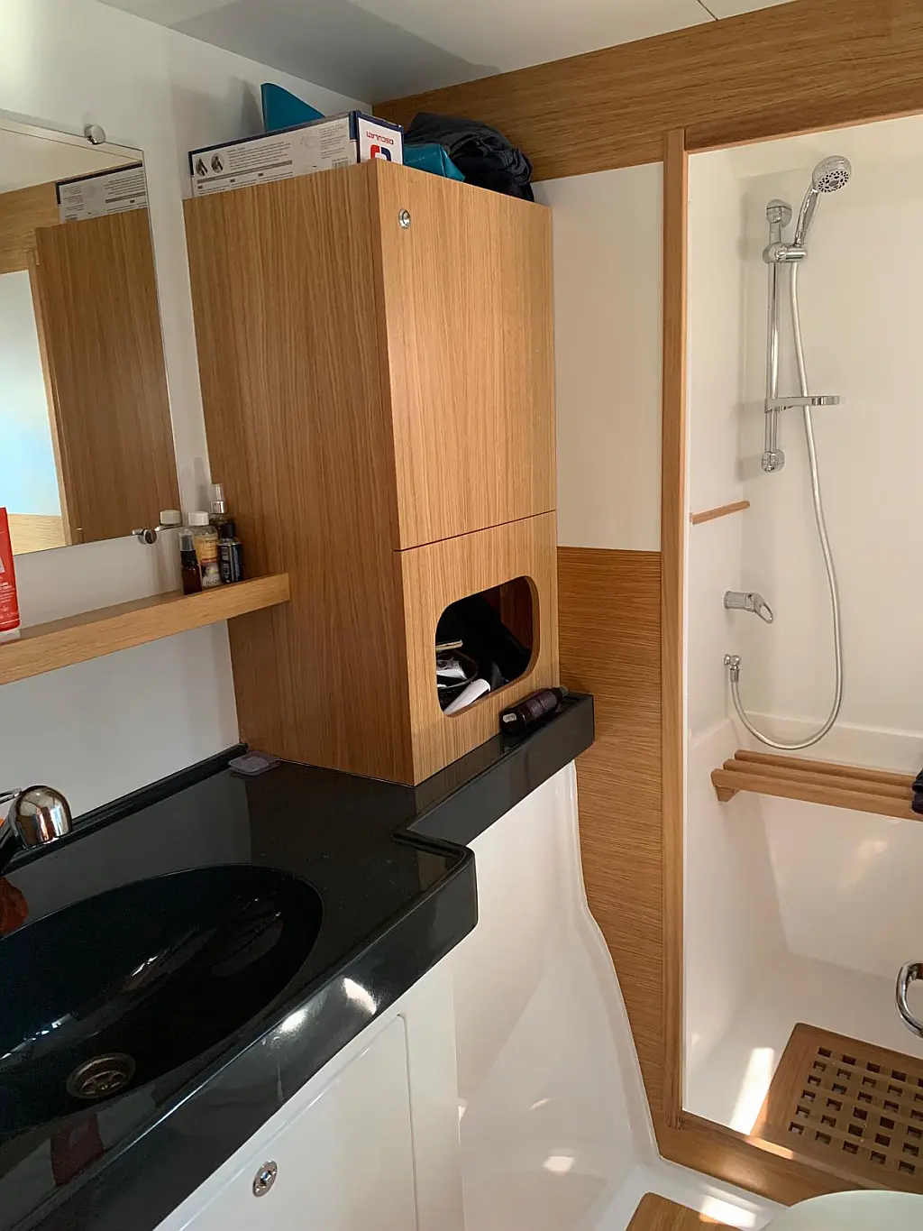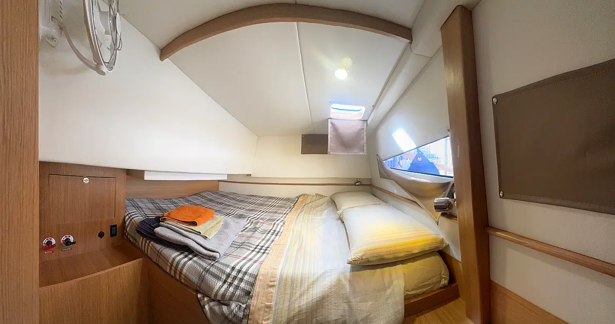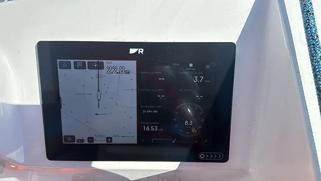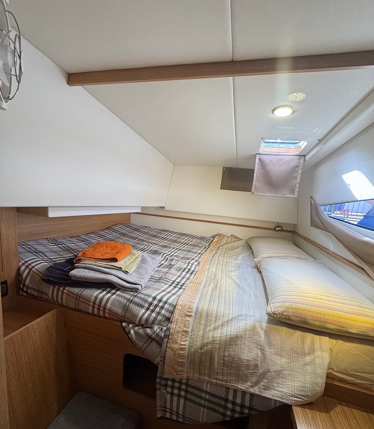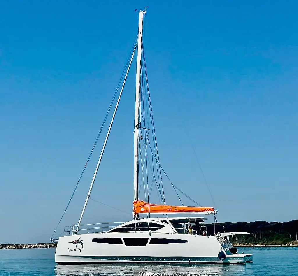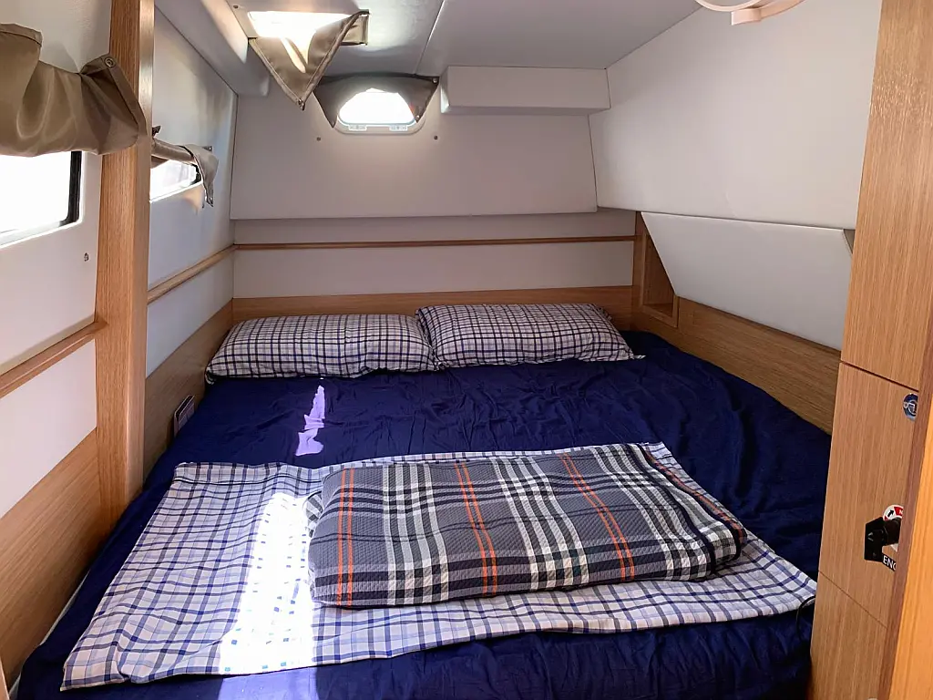 Bimini, Kaffeemaschine, Elektrische Toilette, Elektrische Winch (Segel), Inverter, Kühlschrank, Solar-Panele, Sprayhood, Beiboot, Wassermacher