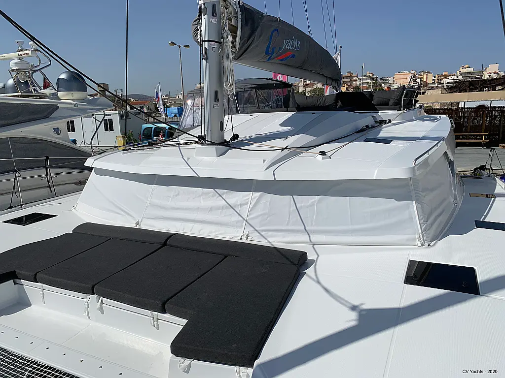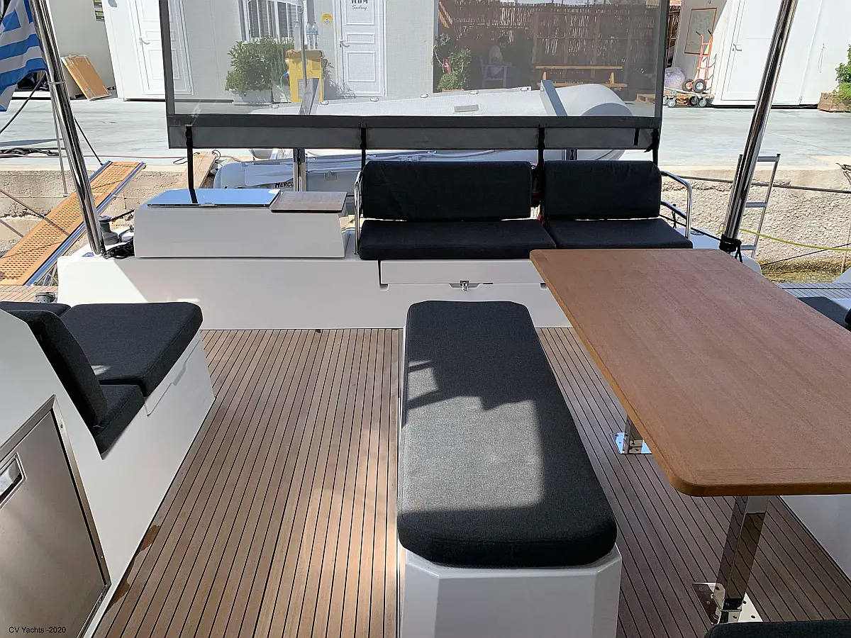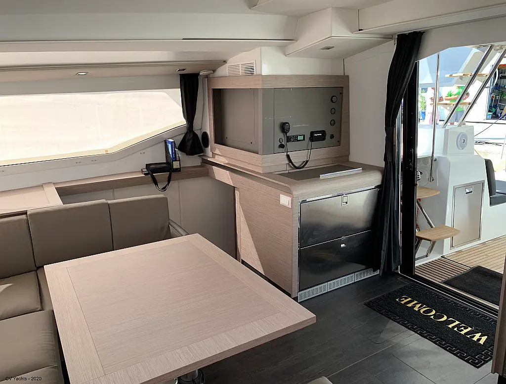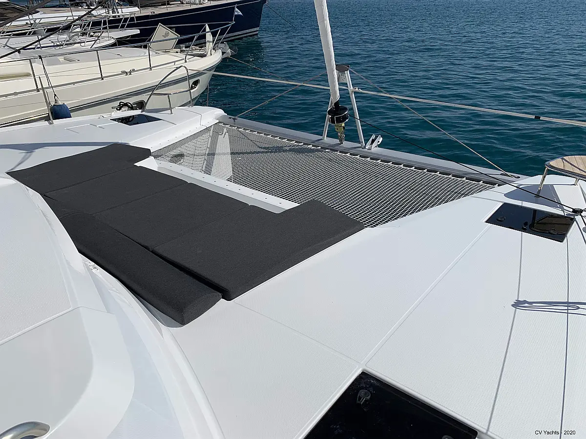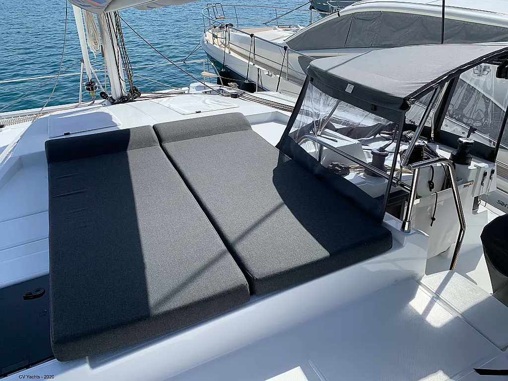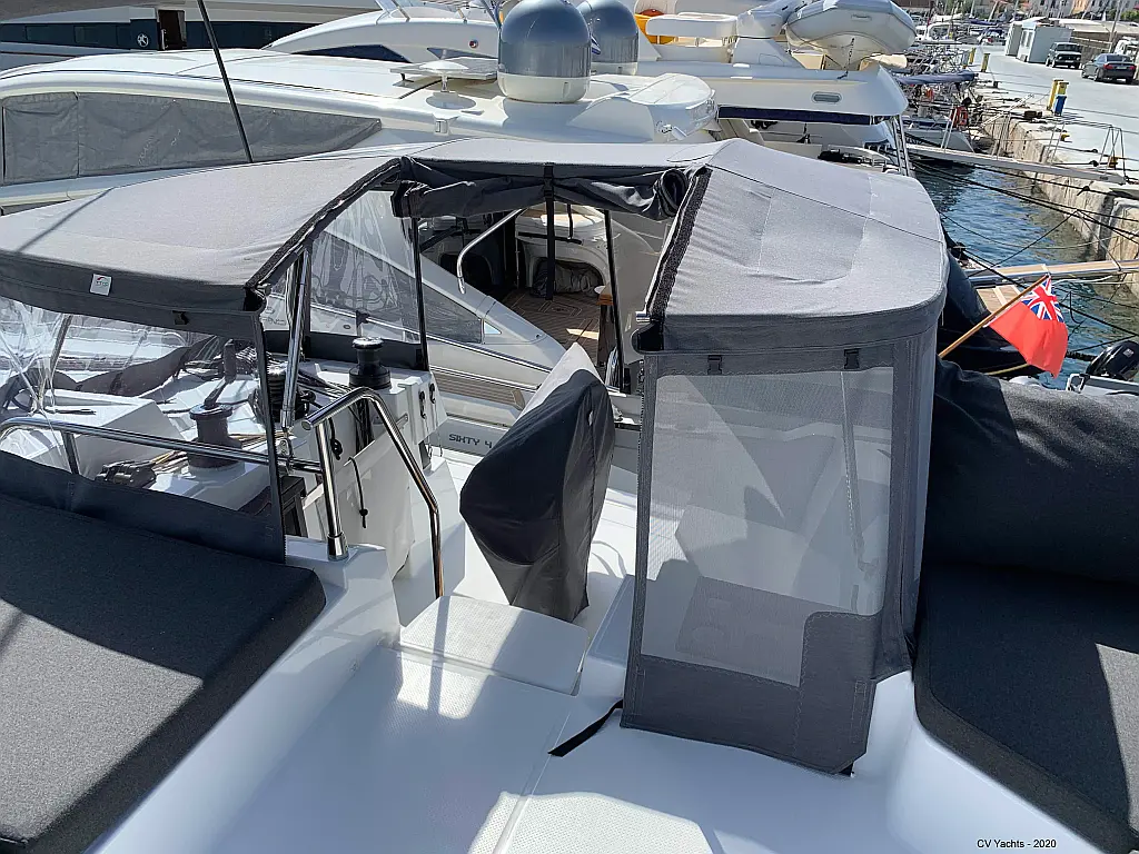 Solar-Panele, Wassermacher, Klimaanlage, Bimini, Sprayhood, Kühlschrank, Inverter, Elektrische Winch (Segel), Beiboot, Hydraulische Gangway, Elektrische Toilette, Fäkalientank, Generator