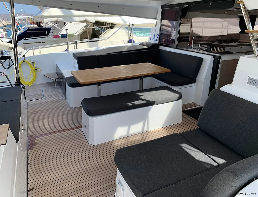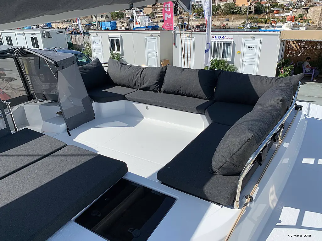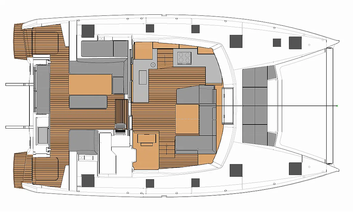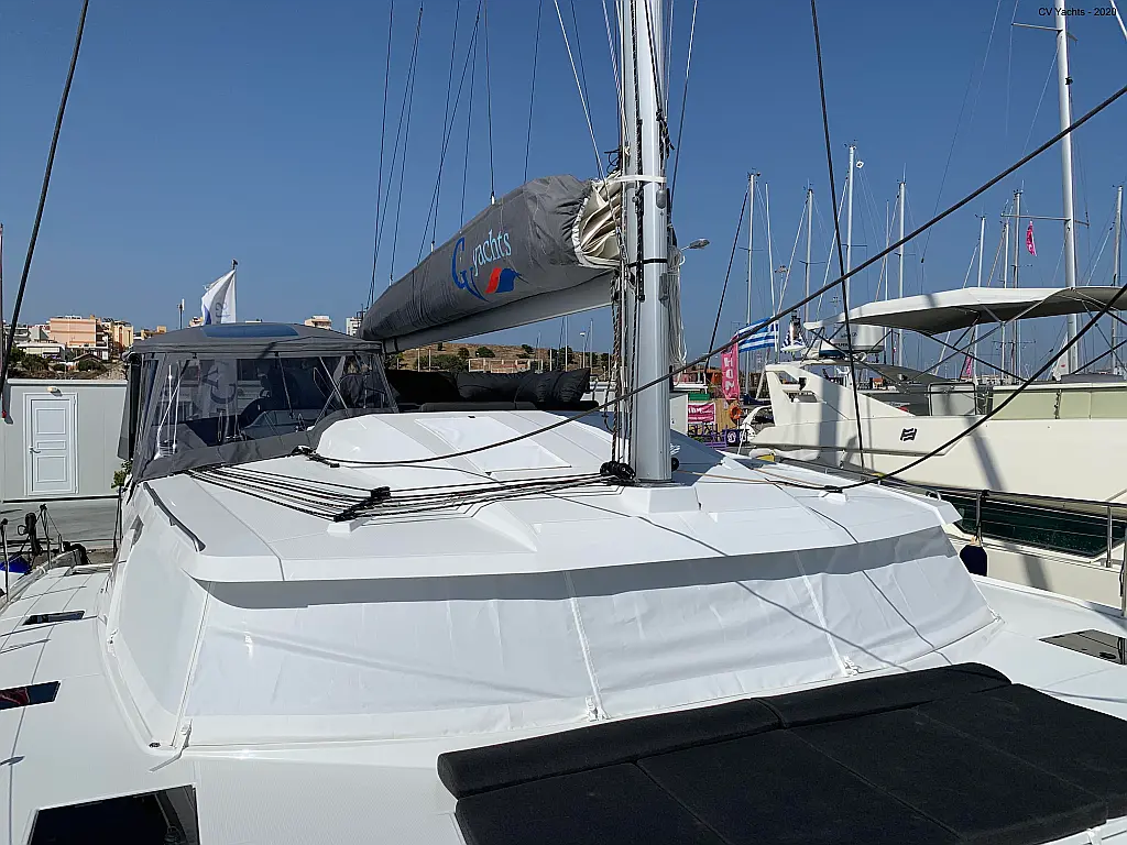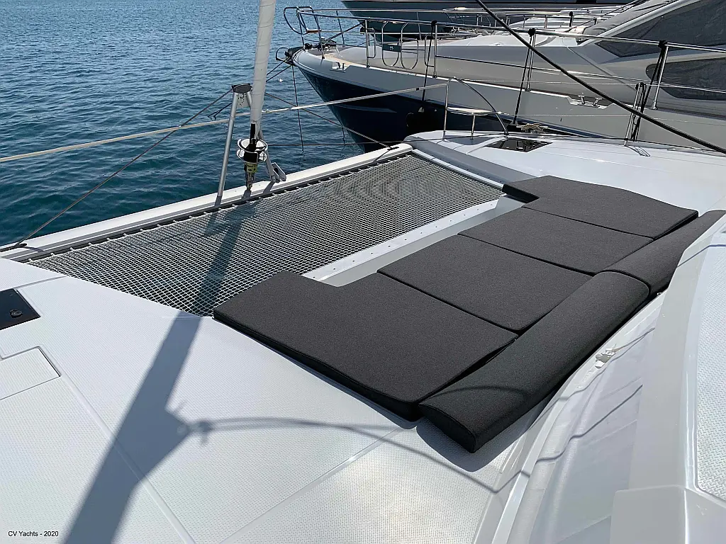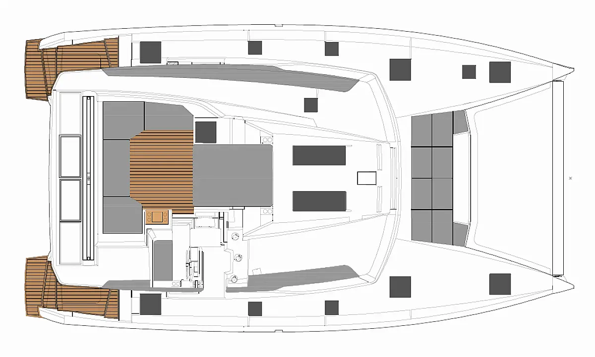 Solar-Panele, Wassermacher, Klimaanlage, Bimini, Sprayhood, Kühlschrank, Inverter, Elektrische Winch (Segel), Beiboot, Hydraulische Gangway, Elektrische Toilette, Fäkalientank, Generator