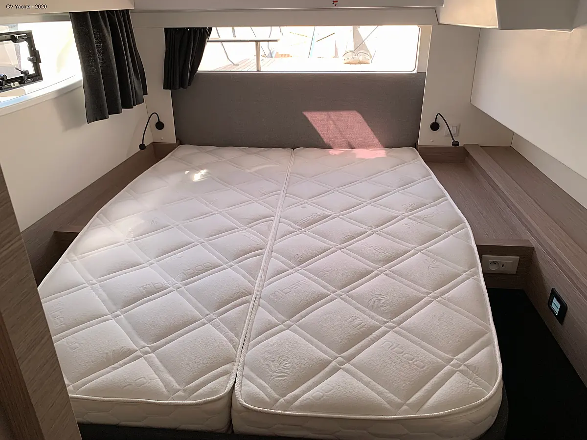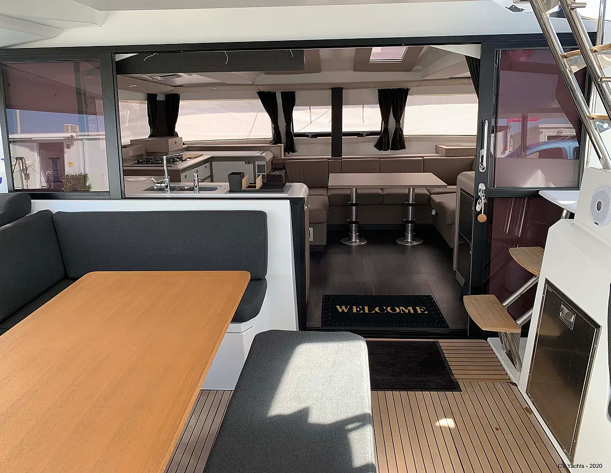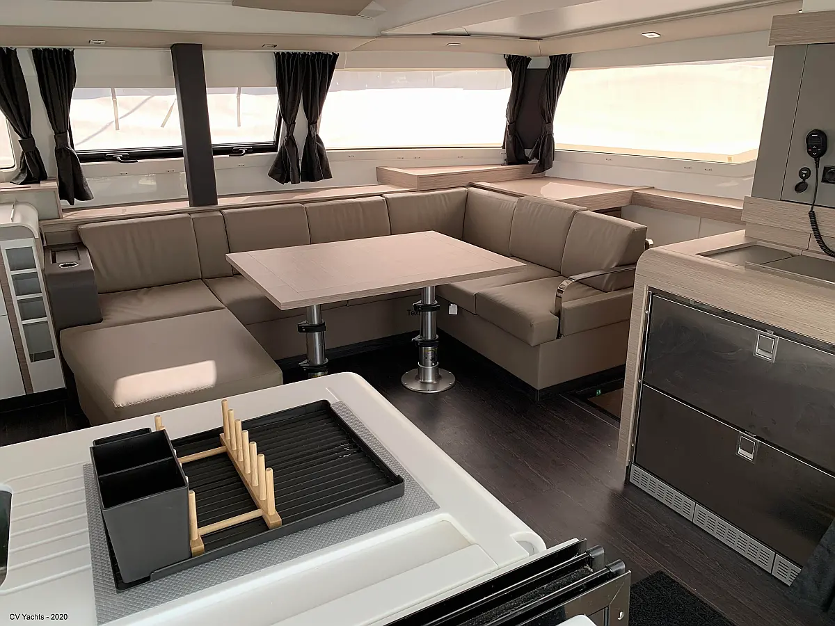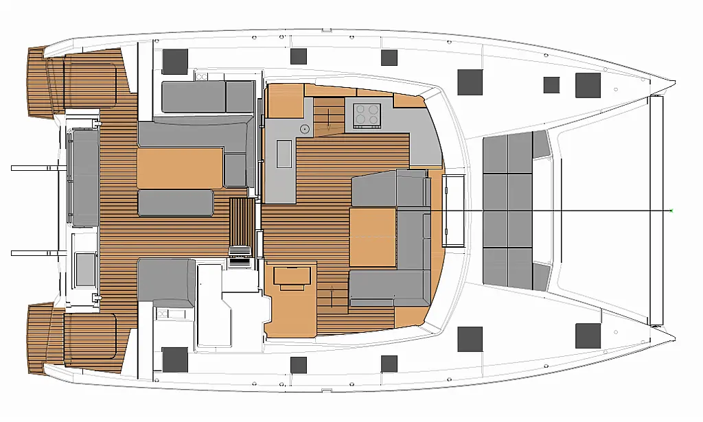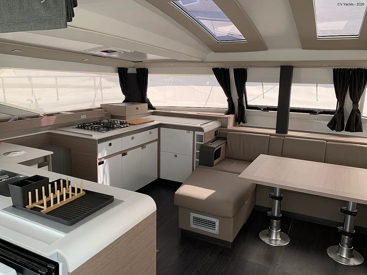 Solar-Panele, Wassermacher, Klimaanlage, Bimini, Sprayhood, Kühlschrank, Inverter, Elektrische Winch (Segel), Beiboot, Hydraulische Gangway, Elektrische Toilette, Fäkalientank, Generator
