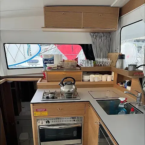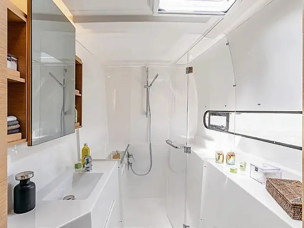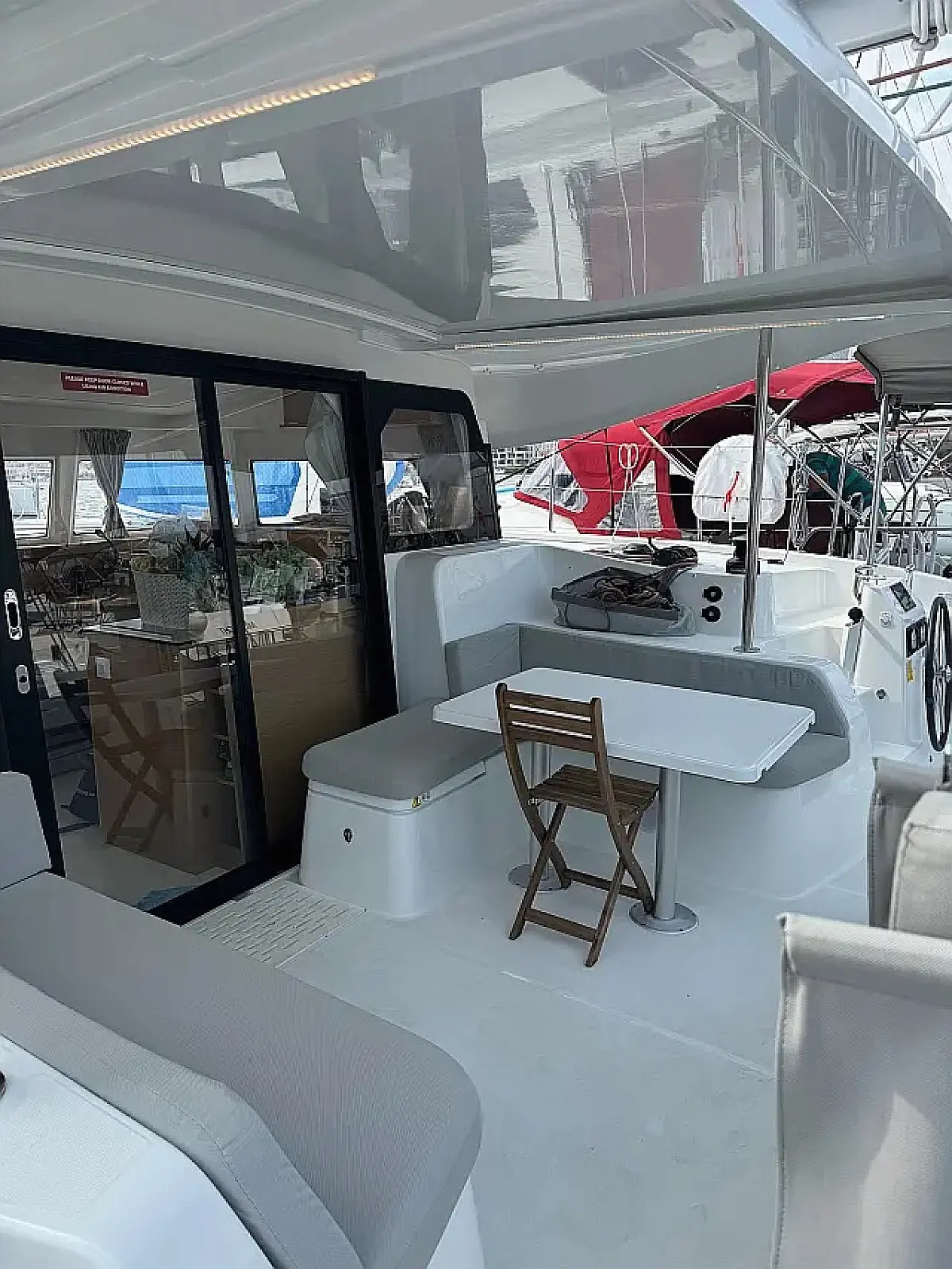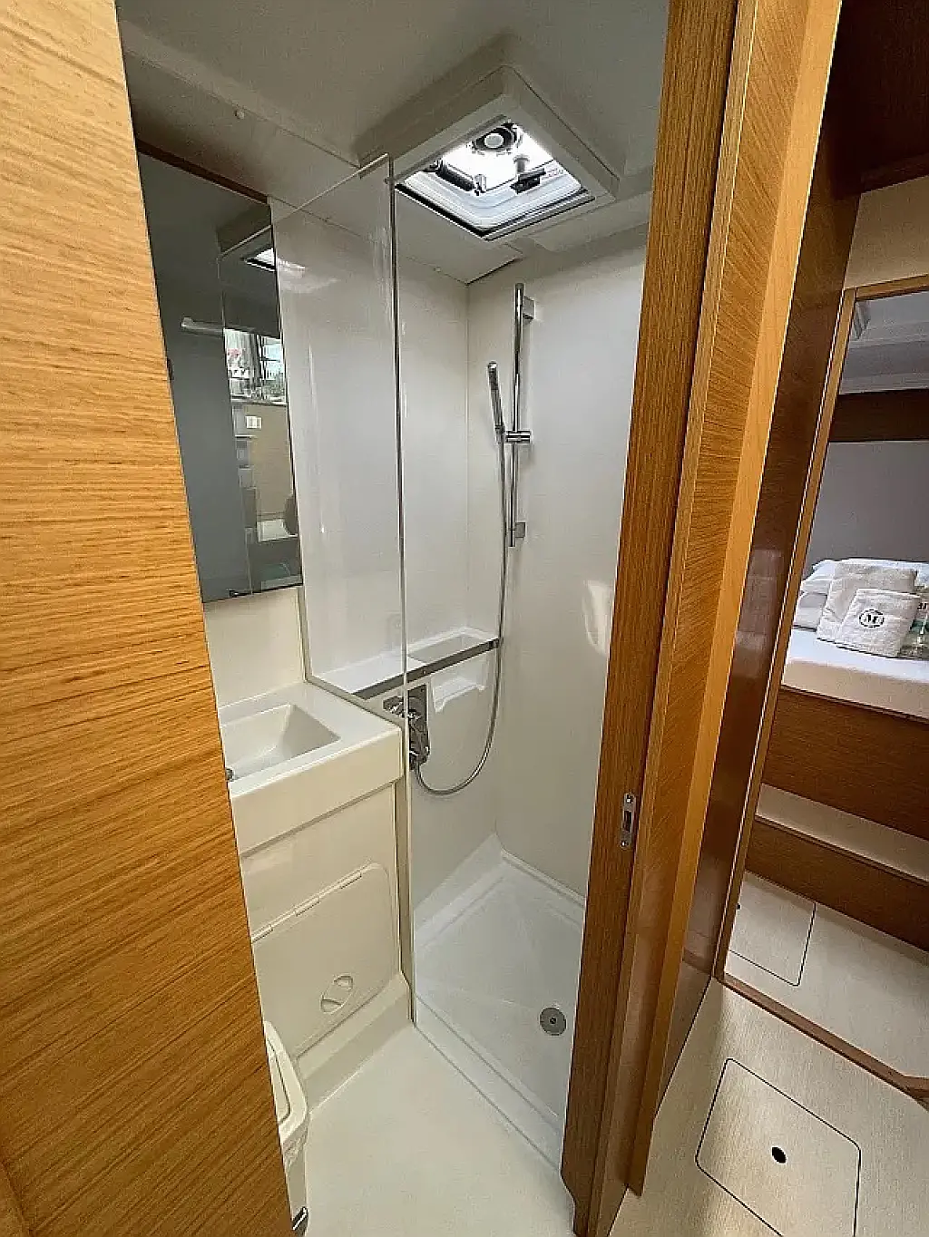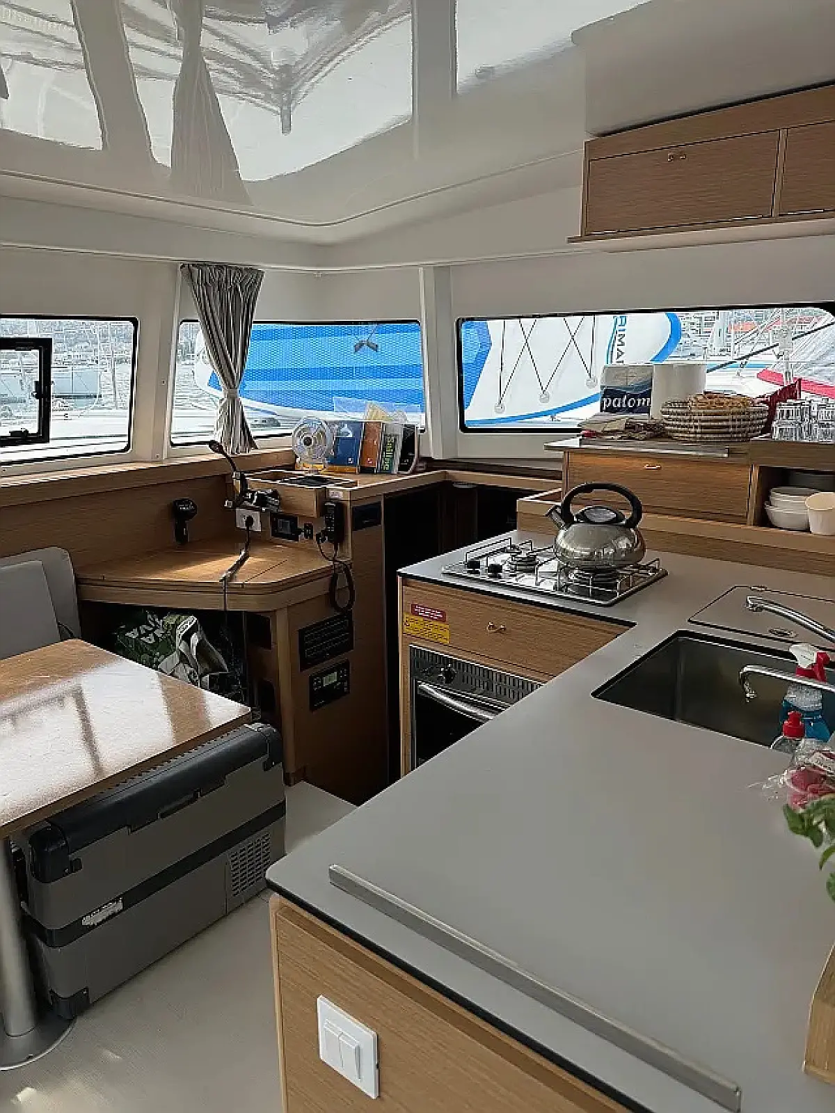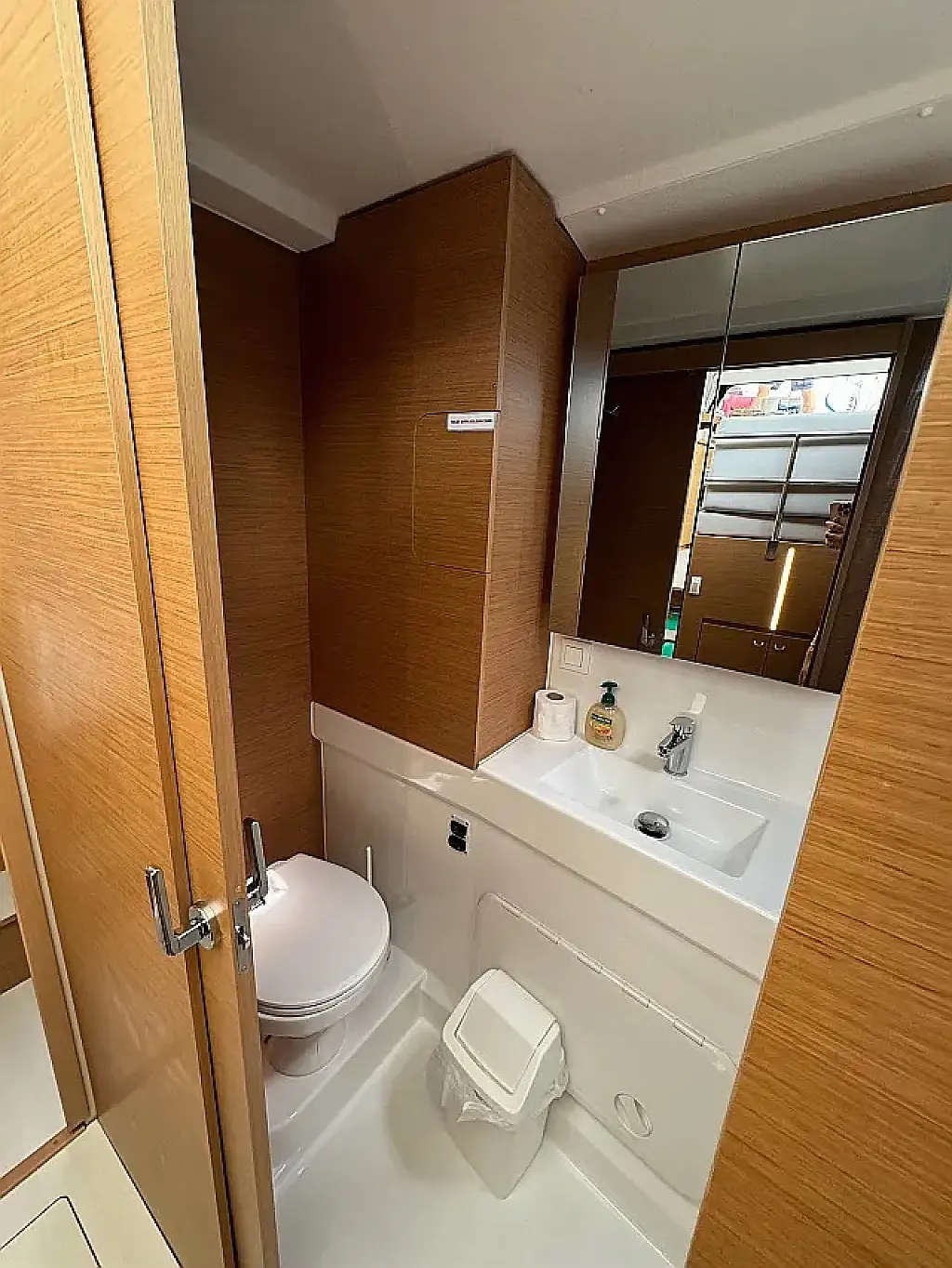 Klimaanlage, Bimini, Cockpit-Kissen, Lautsprecher im Cockpit, Kaffeemaschine, Kühlschrank, Elektrische Toilette, Generator, Heizung, Fäkalientank, Inverter, Außenbordmotor, Solar-Panele, Wi-Fi und Internet