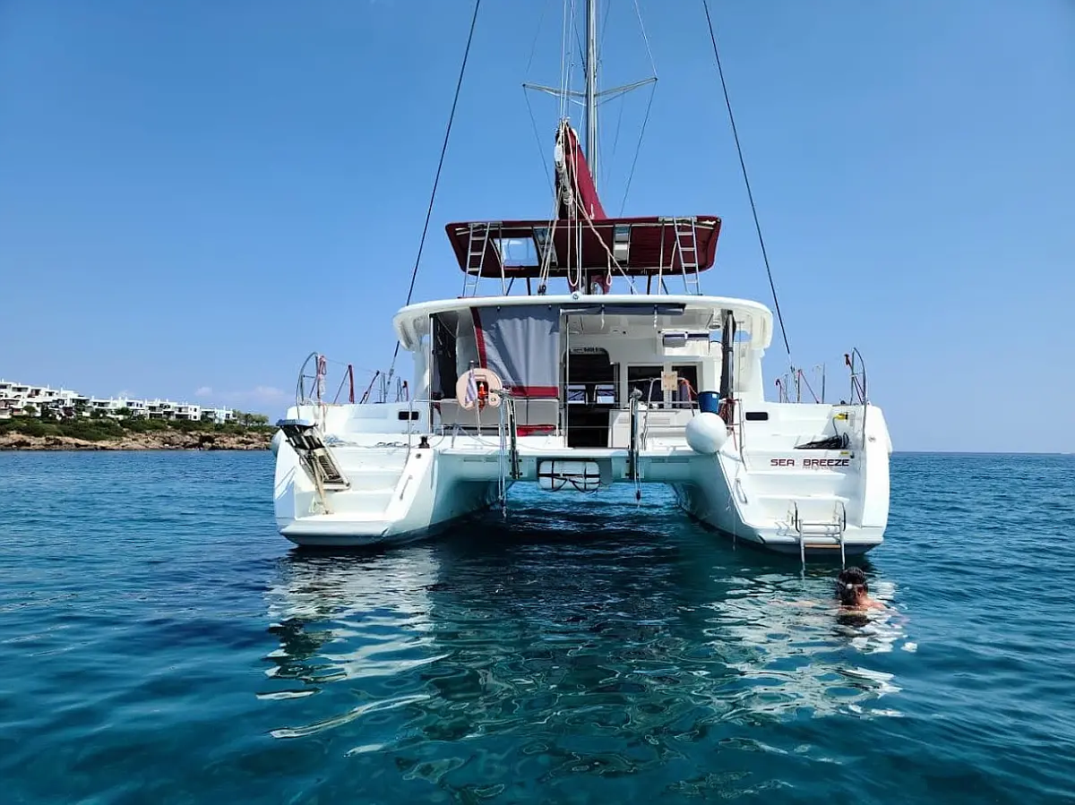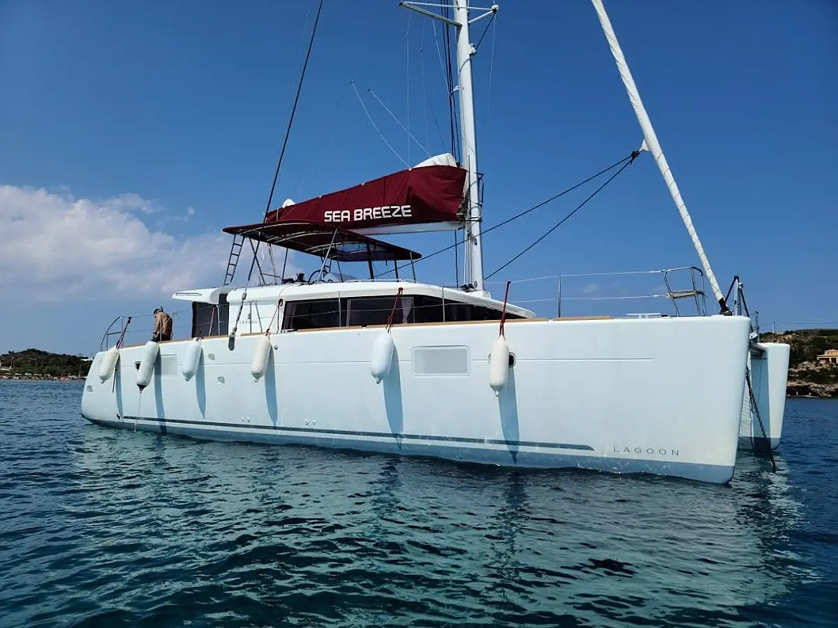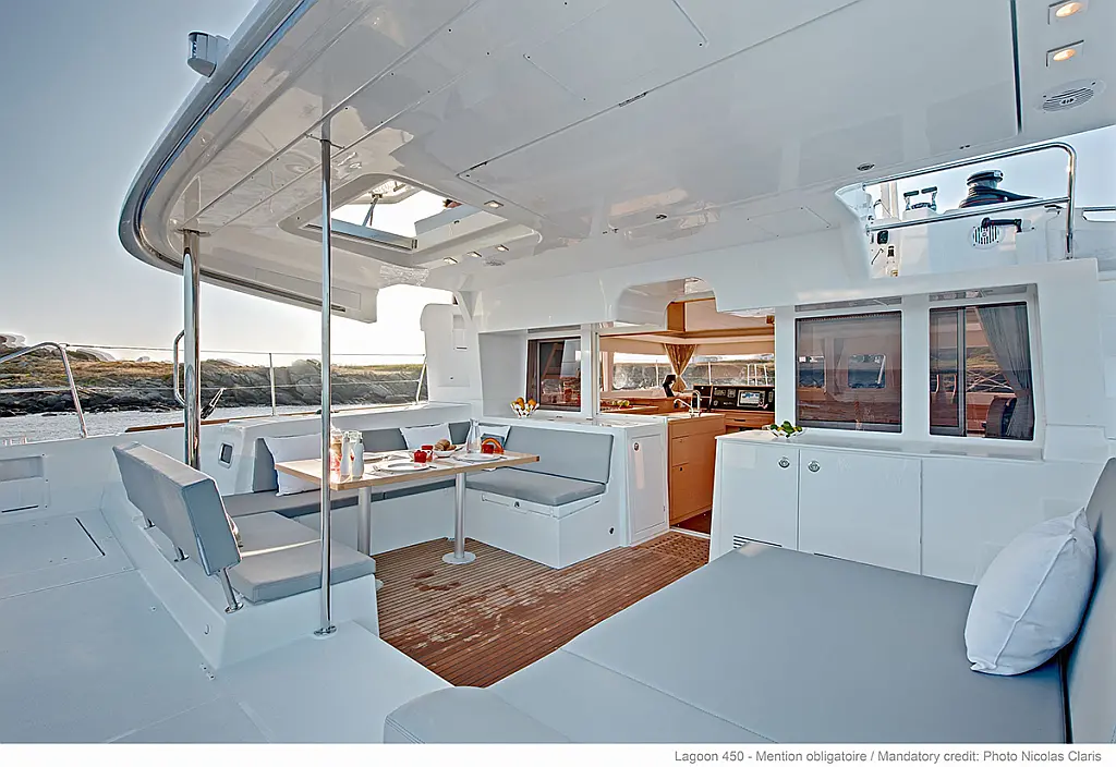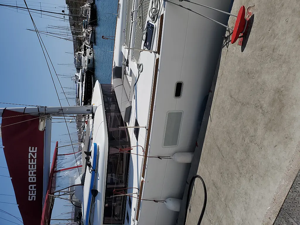 Klimaanlage, Bimini, Elektrische Toilette, Generator, Inverter, Sprayhood, Wassermacher, Elektrische Winch (Segel), Cockpit-Kissen, Kaffeemaschine, Außenbordmotor, Beiboot