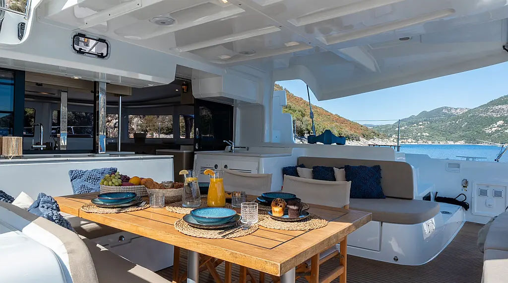 Lautsprecher im Cockpit, Wi-Fi und Internet, Eismaschine, Außenbordmotor, Hydraulische Gangway, Bimini, Wassermacher, Klimaanlage, Inverter, Elektrische Toilette, Kaffeemaschine, Beiboot, Teakdeck, Cockpit-Kissen, Grill im Cockpit