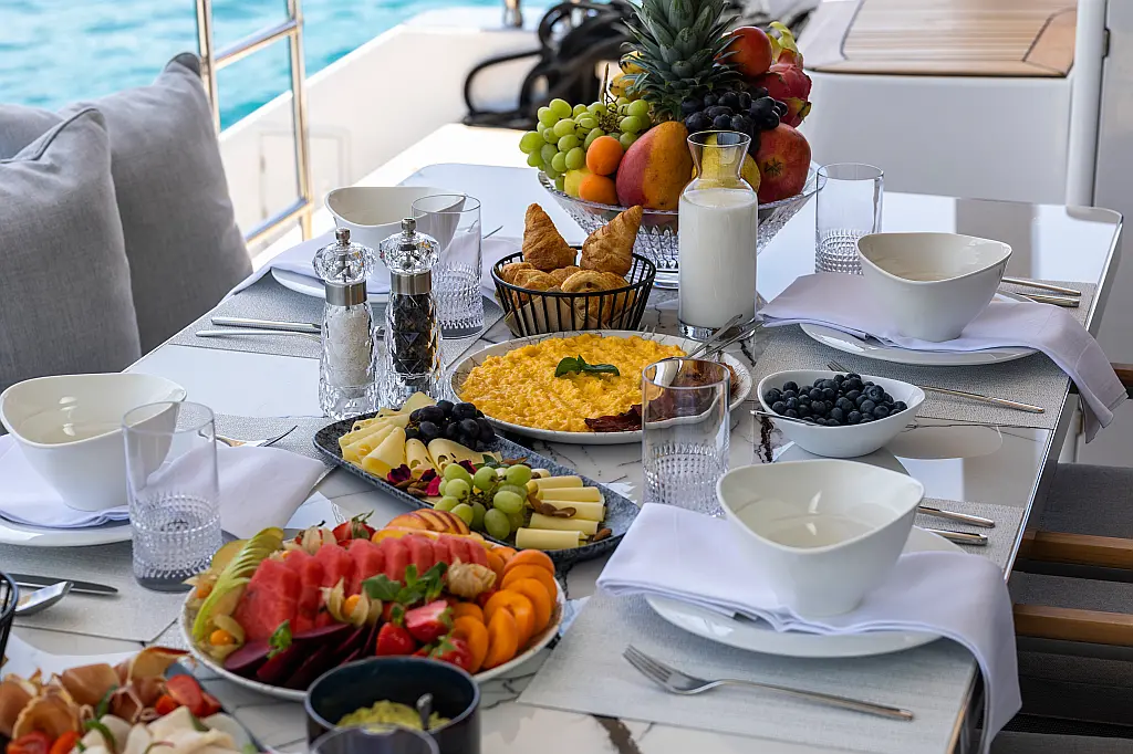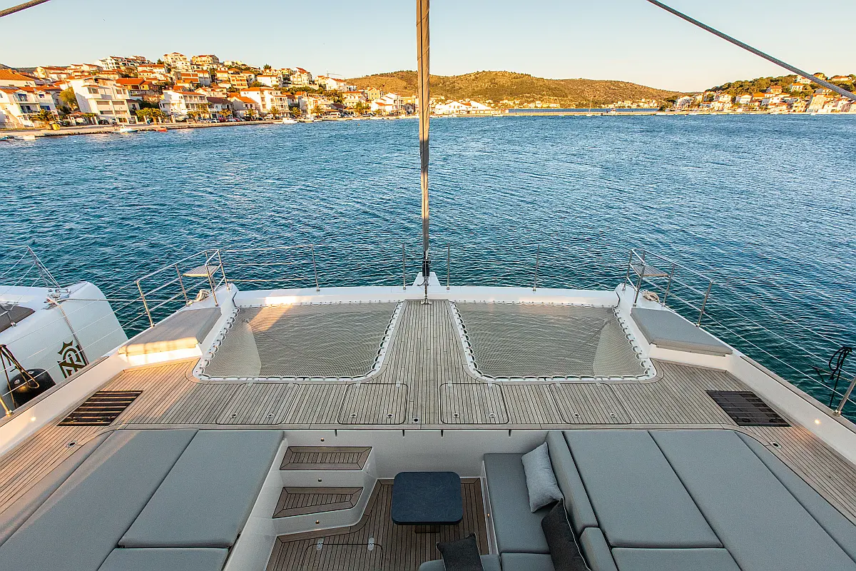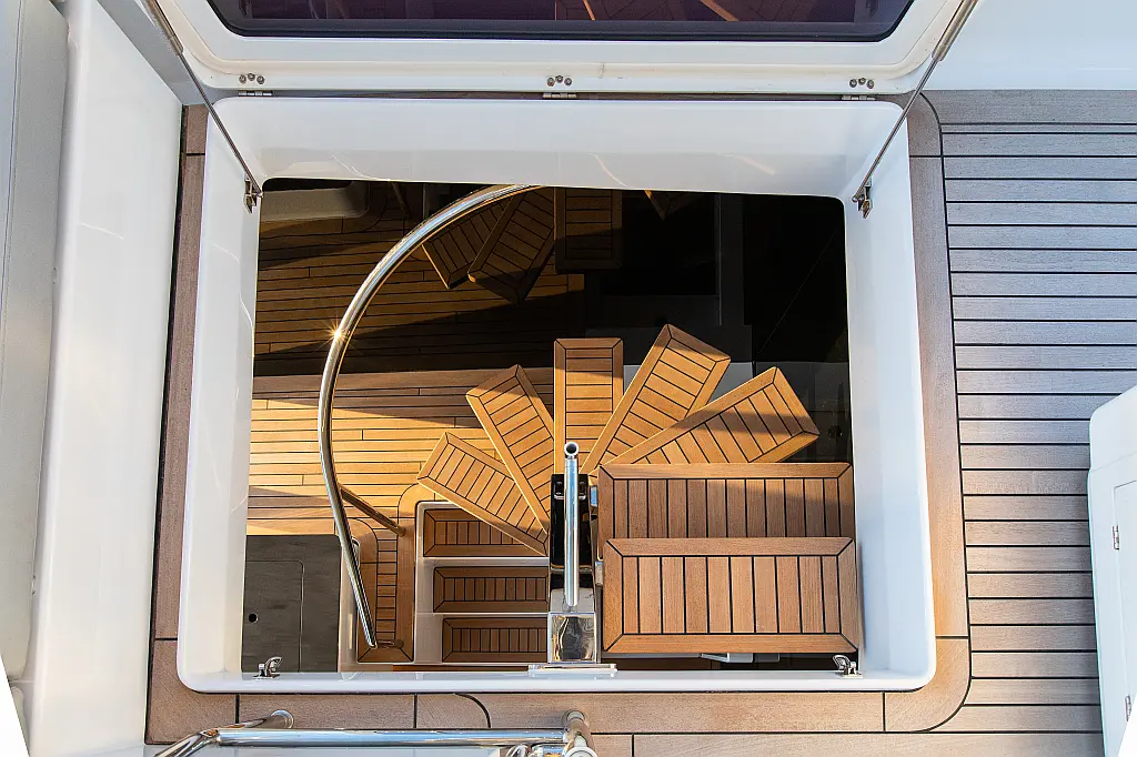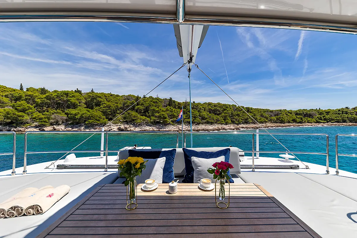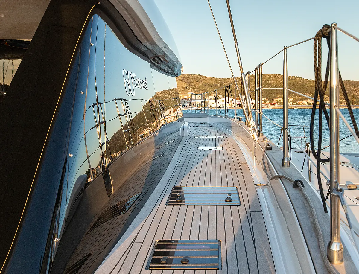 Teakdeck, Cockpit-Kissen, Außenbordmotor, Badeplattform, Hydraulische Gangway, Kühlschrank, Teak Cockpit, Beiboot, Heizung, Klimaanlage, Generator, Wassermacher, Lautsprecher im Cockpit, Wi-Fi und Internet, Elektrische Toilette, Waschtrockner, Eismaschine, Geschirrspüler