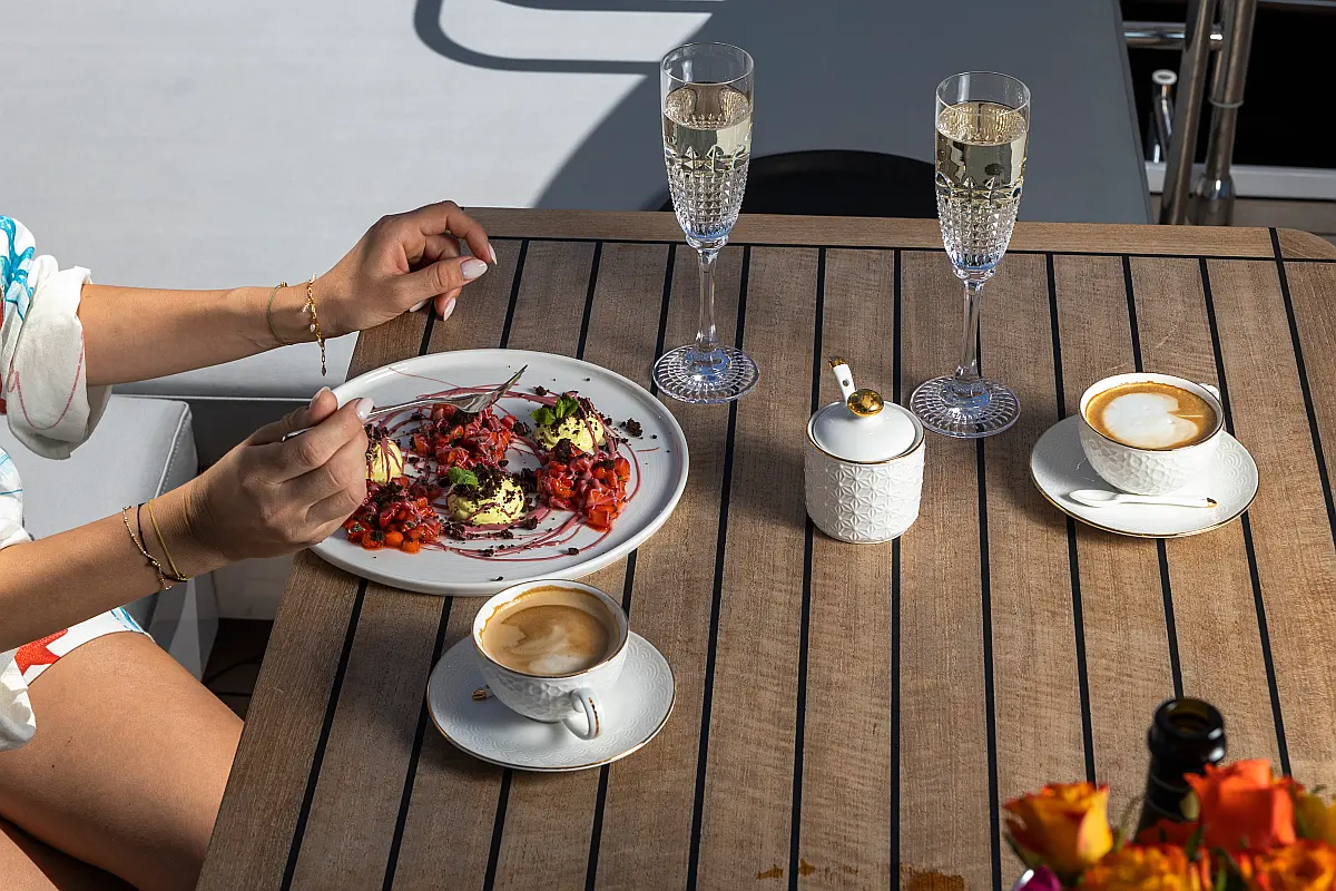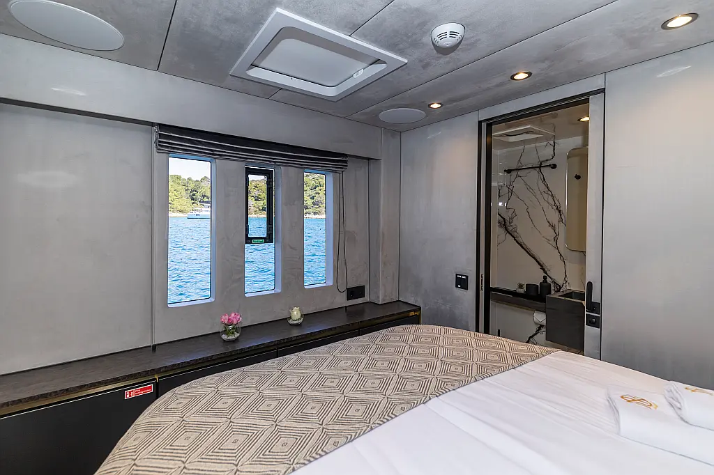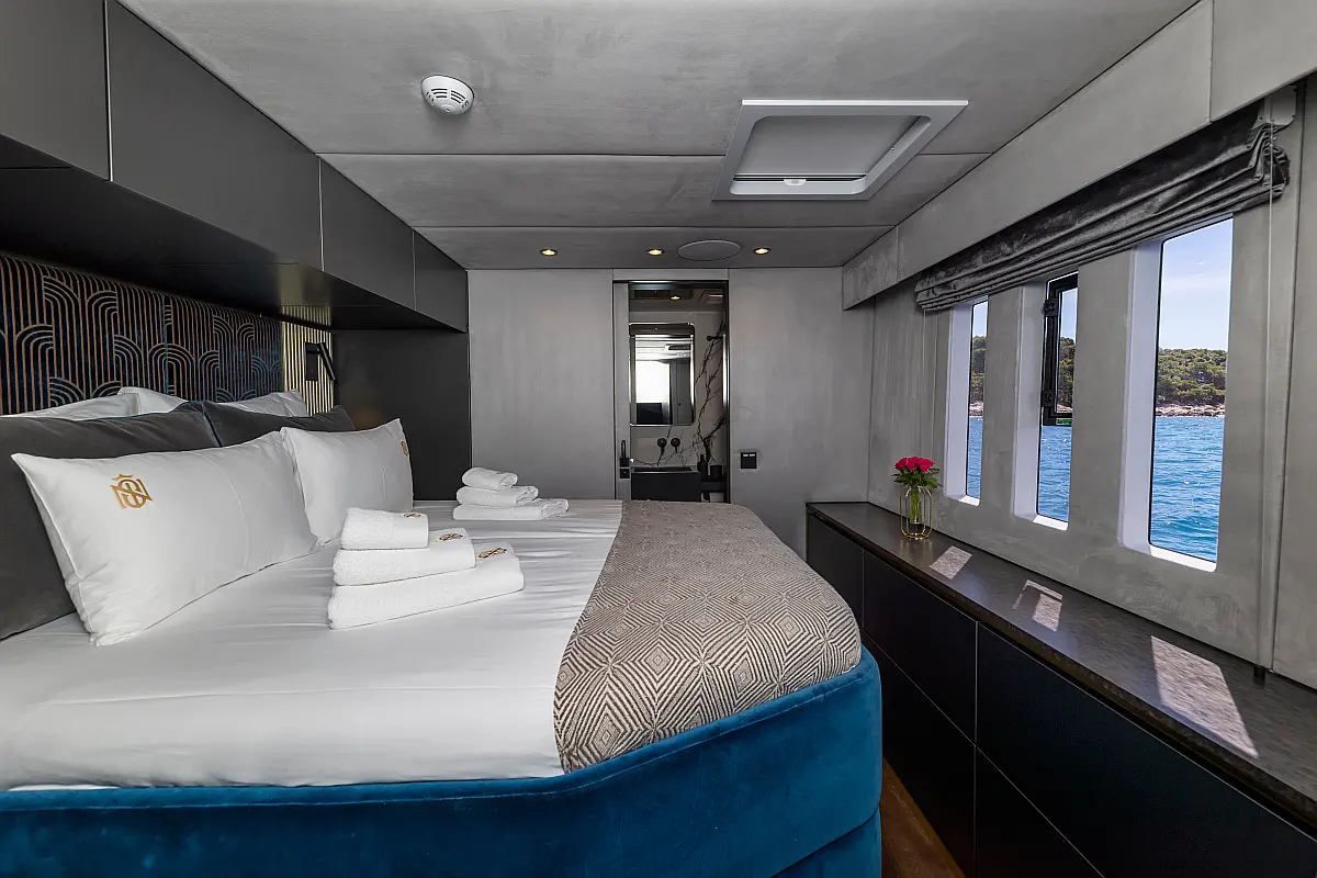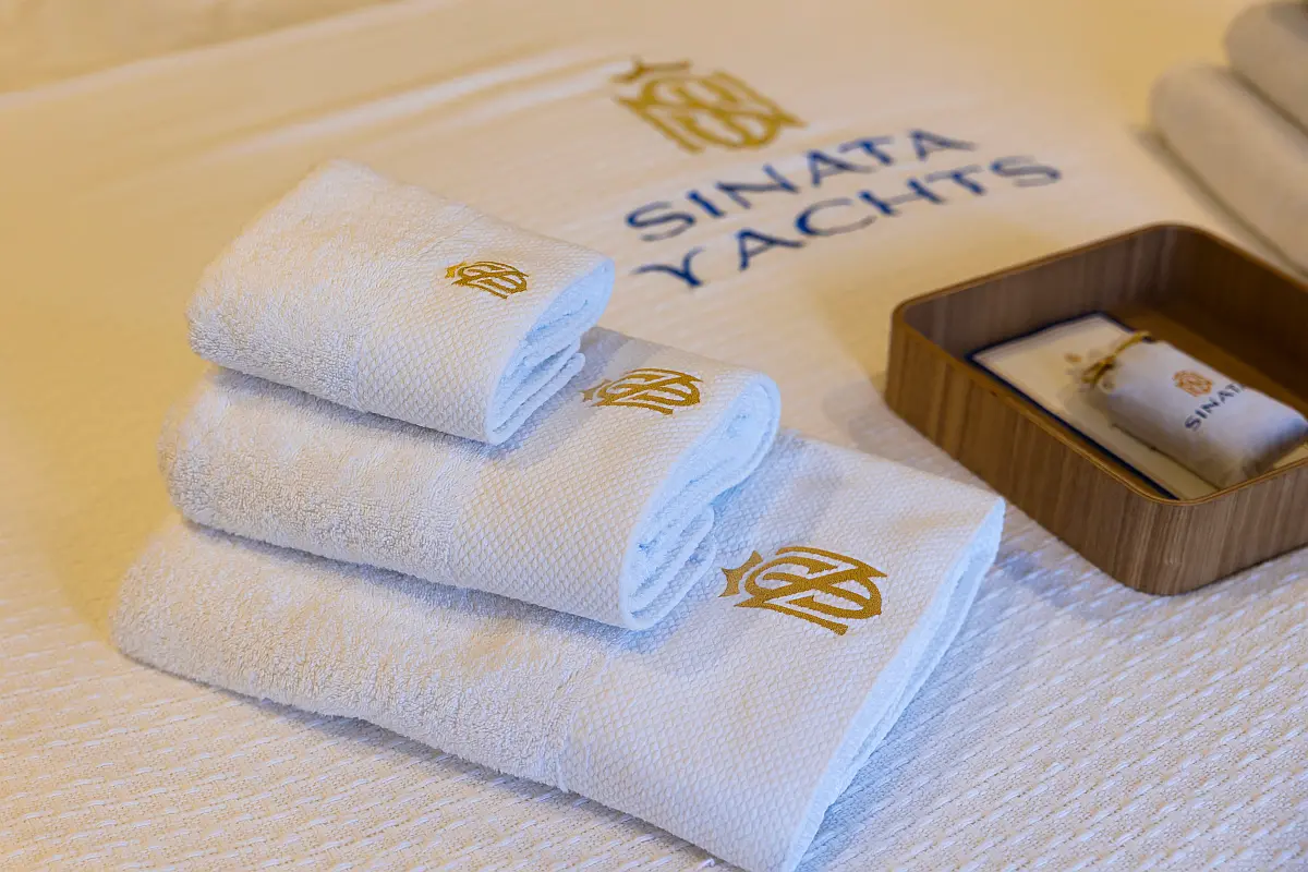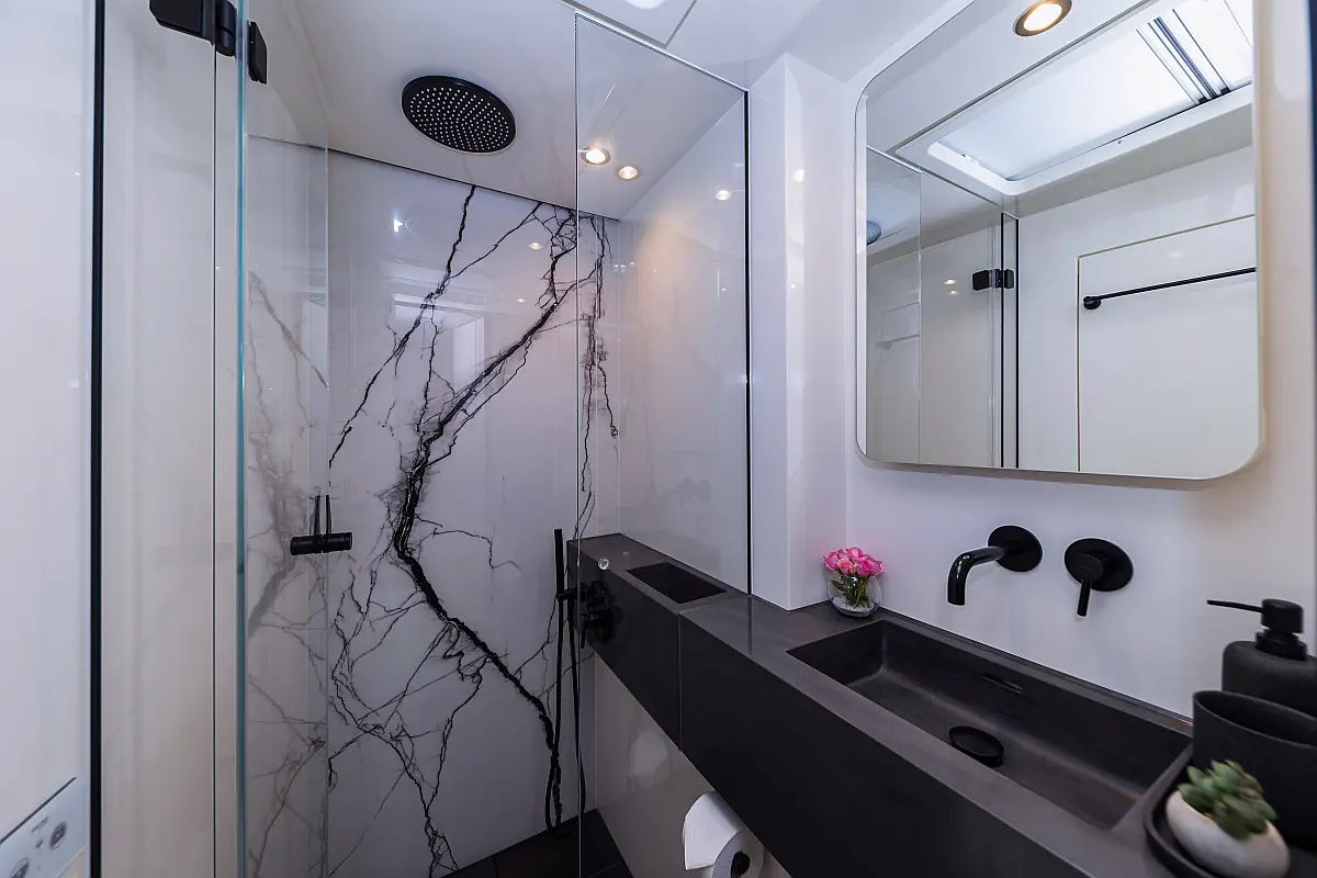Teakdeck, Cockpit-Kissen, Außenbordmotor, Badeplattform, Hydraulische Gangway, Kühlschrank, Teak Cockpit, Beiboot, Heizung, Klimaanlage, Generator, Wassermacher, Lautsprecher im Cockpit, Wi-Fi und Internet, Elektrische Toilette, Waschtrockner, Eismaschine, Geschirrspüler