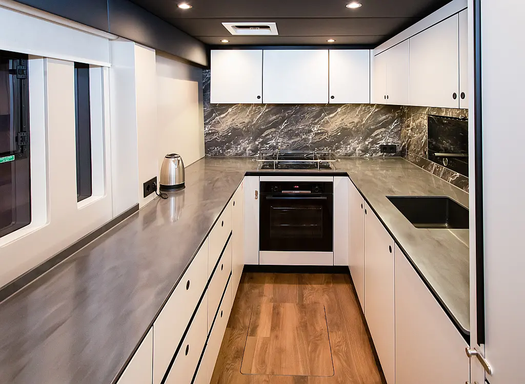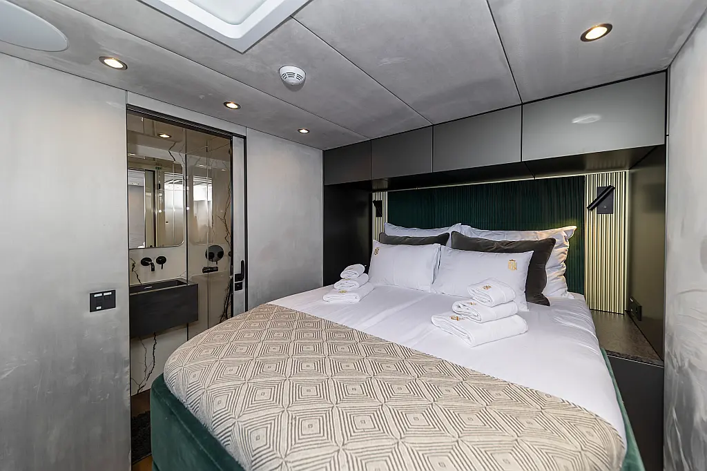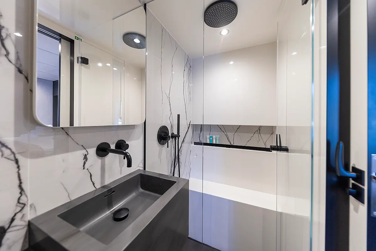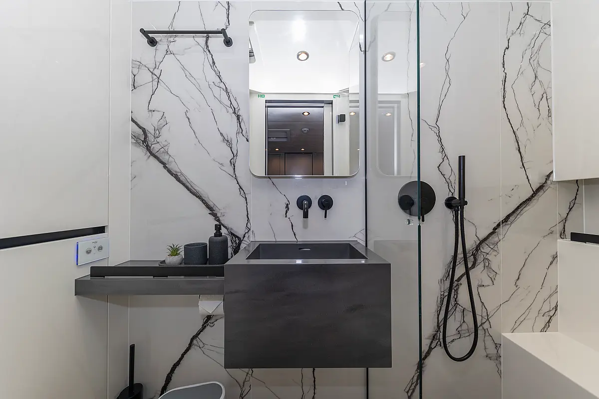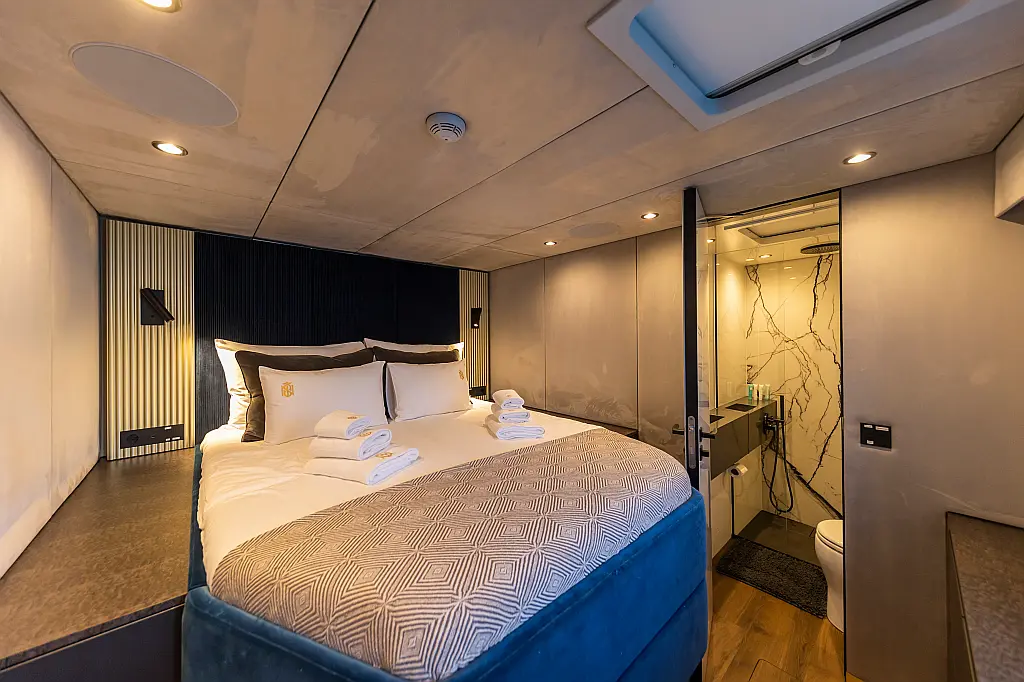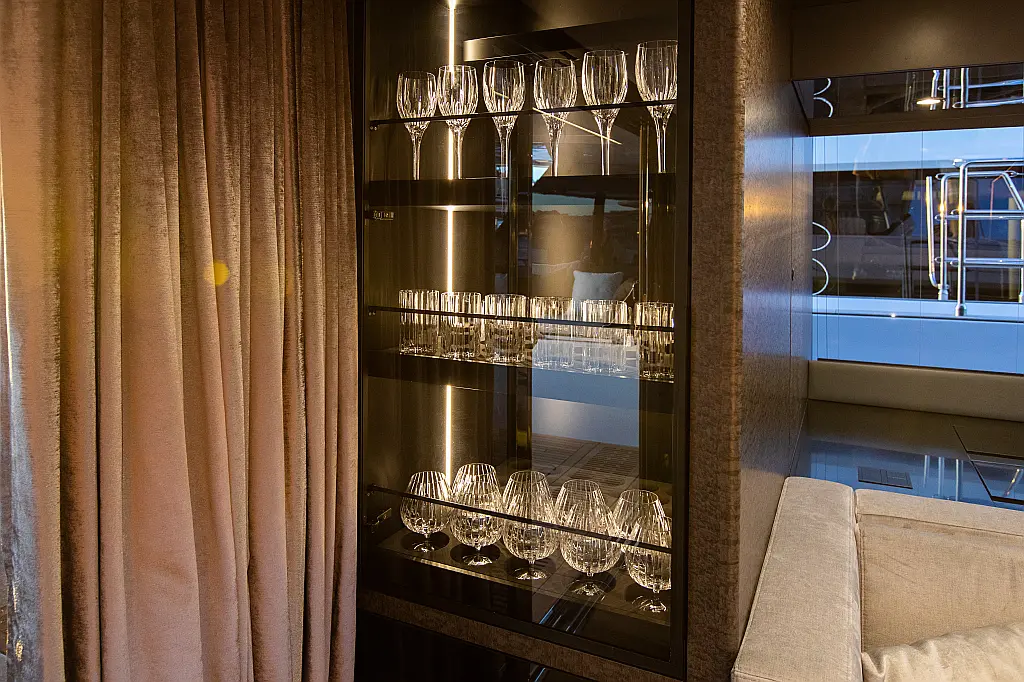 Teakdeck, Cockpit-Kissen, Außenbordmotor, Badeplattform, Hydraulische Gangway, Kühlschrank, Teak Cockpit, Beiboot, Heizung, Klimaanlage, Generator, Wassermacher, Lautsprecher im Cockpit, Wi-Fi und Internet, Elektrische Toilette, Waschtrockner, Eismaschine, Geschirrspüler